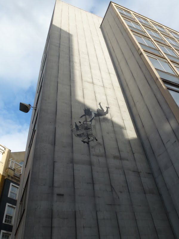 Réalisé en novembre 2011 (quelques mois avant les jeux de Londres), ce pochoir de Banksy fit l’effet d’une bombe. Le message est clair : Le consumérisme est une chute en vol libre dans un puit de désillusions. Comme à son habitude, l’emplacement renforce le message : un immeuble de bureaux situé Bruton Lane, à quelques centaines de mètres de Oxford Street et Regent Street , haut lieu de la consommation londonienne. Banksy est un génie !