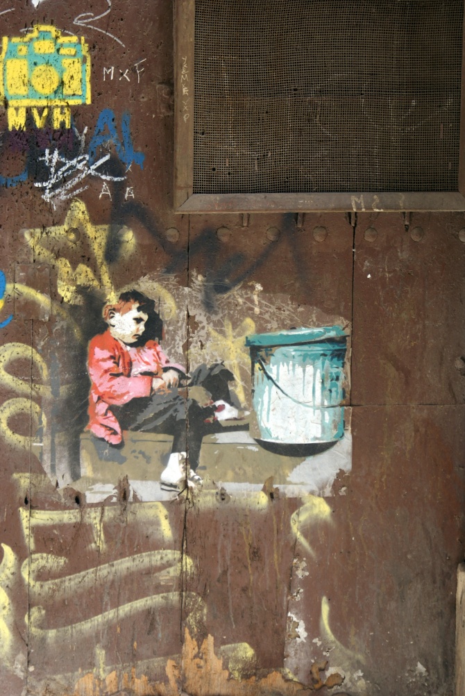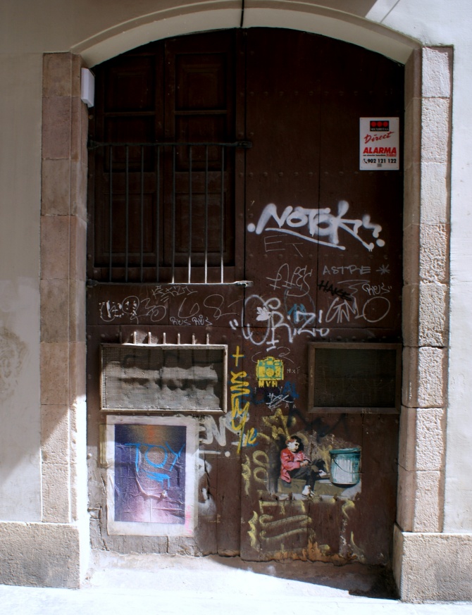 Le quartier du Raval à Barcelone est une véritable galerie à ciel ouvert pour y observer les nombreuses oeuvres de Btoy, ici un petit garçon sur une porte de la Carrer de la Paloma.