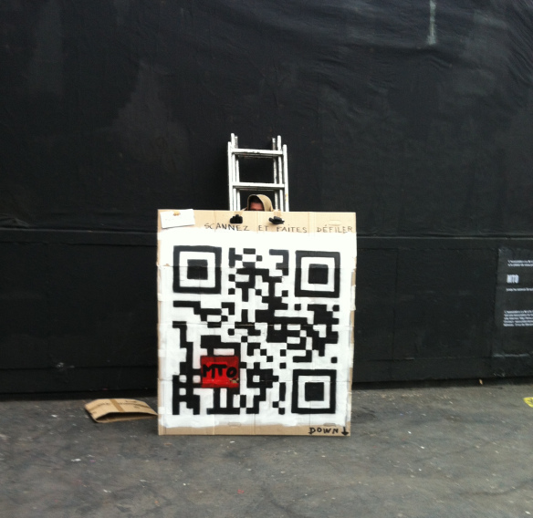 A 18h00 donc, retour devant le « mur »… un homme cagoulé arrive et déplie un carton d’environ 2m2 sur lequel est présent un QRcode. Un message additionnel informe les spectateurs que cette personne restera sur place 30mn, et que le QRcode pourra être ensuite collé sur le « mur » selon le souhait et l’envie de l’association. Le code renvoie sur un diaporama Flickr intitulé « TAGTICAL MEDIA 2 – Paris sous mes bombes« , dans lequel défile une série de 43 photos. Les photos font apparaitre des messages taggués par MTO sur les murs parisiens.