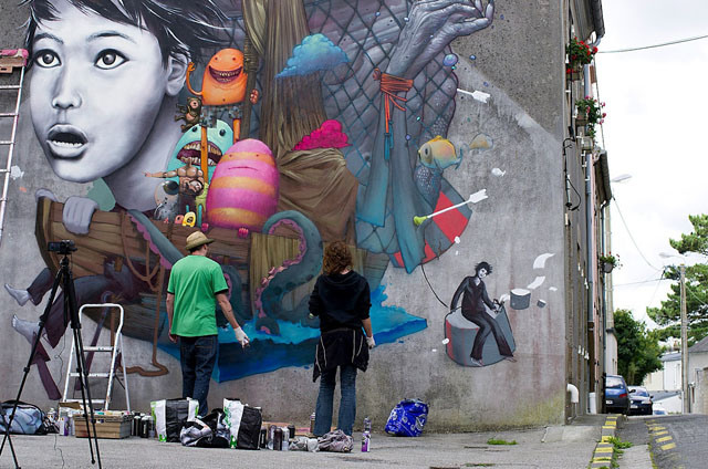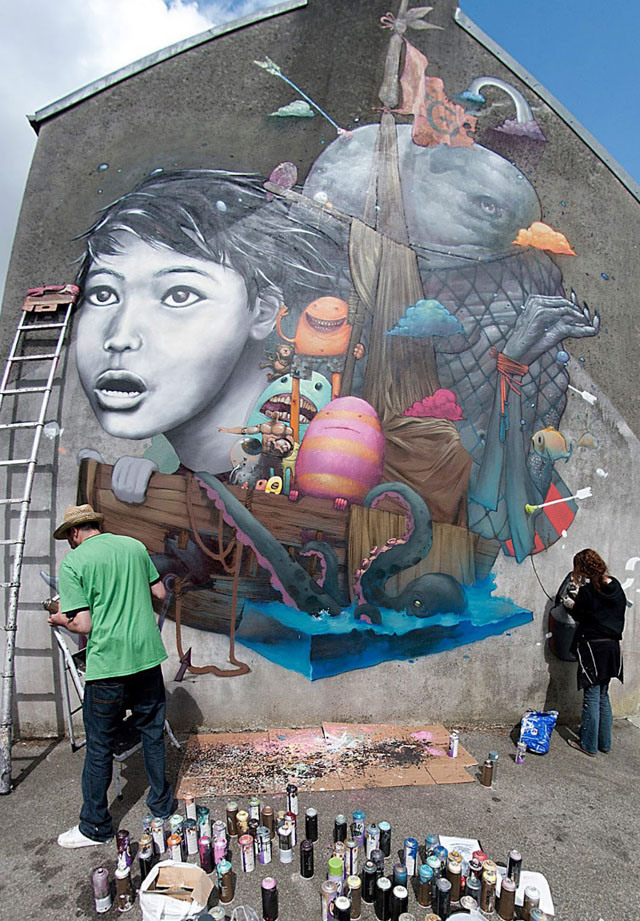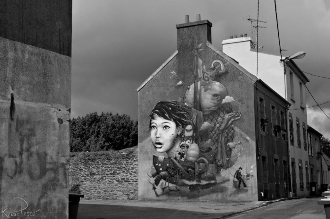 Fresque peinte à 4 mains par Liliwenn et Bom.k dans le cadre du projet « Crimes of Minds » (projet d’art urbain dans la ville de Brest initié et piloté par Liliwenn). Une semaine de travail cumulé aura été nécessaire pour ce mur peint en juin 2012. Il évoque le rêve d’un enfant envahi par son imaginaire (l’enfant placé en bas à droite de l’oeuvre, assis sur une bouée, lit le livre de sa propre histoire projeté sur le mur, où l’on retrouve les acteurs de ses rêves, de ses cauchemars : ses jouets, ses monstres, etc..). La maison sur laquelle a été peinte cette oeuvre appartient à une assistante maternelle, un petit clin d’oeil contextuel que les artistes ont découvert a posteriori.