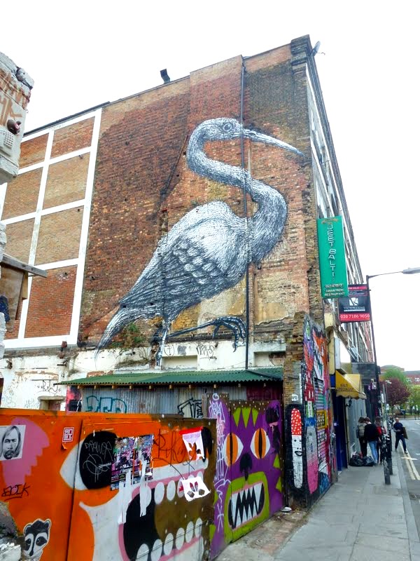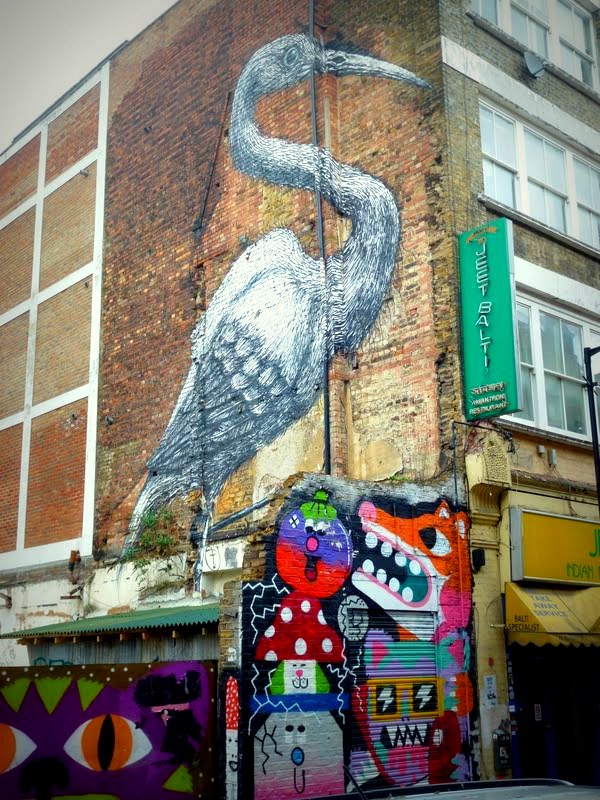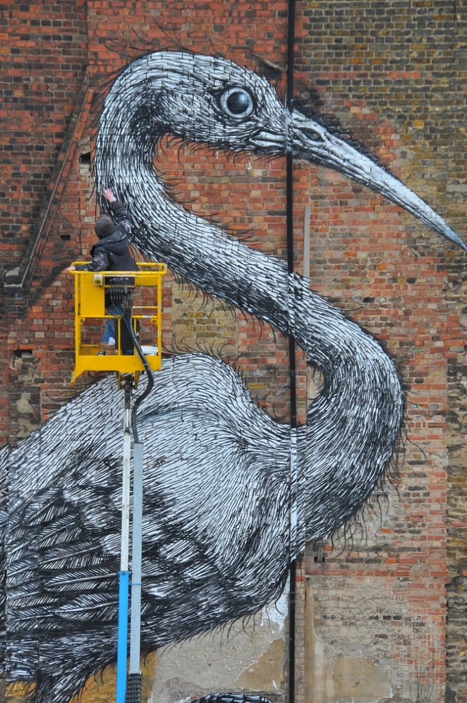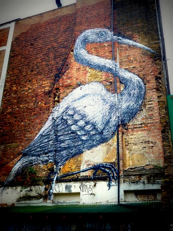 Parmi les oeuvres majeures que l’on peut découvrir dans le célèbre quartier de Shoreditch, prés de Brick Lane (haut lieu du street art mondial), il y a la fameuse « Grue » de l’artiste belge ROA.