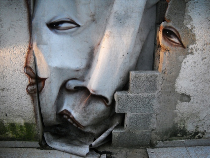 André Muniz Gonzaga, alias Dalata, est un artiste brésilien connu (et reconnu mondialement) pour son art si particulier de « distorsion » de l’environnement, de ses surfaces irrégulières et dégradées. Dalata utilise les taches, les moisissures, les fissures, les plis, les trous et toutes les déformations que l’environnement peut lui offrir pour concevoir des oeuvres expressives, sensibles et poétiques. Celle-ci a été réalisée en 2010 à Cubatão, une ville de l’État de São Paulo.