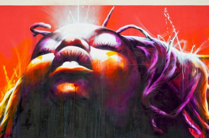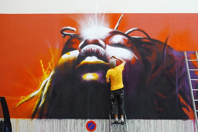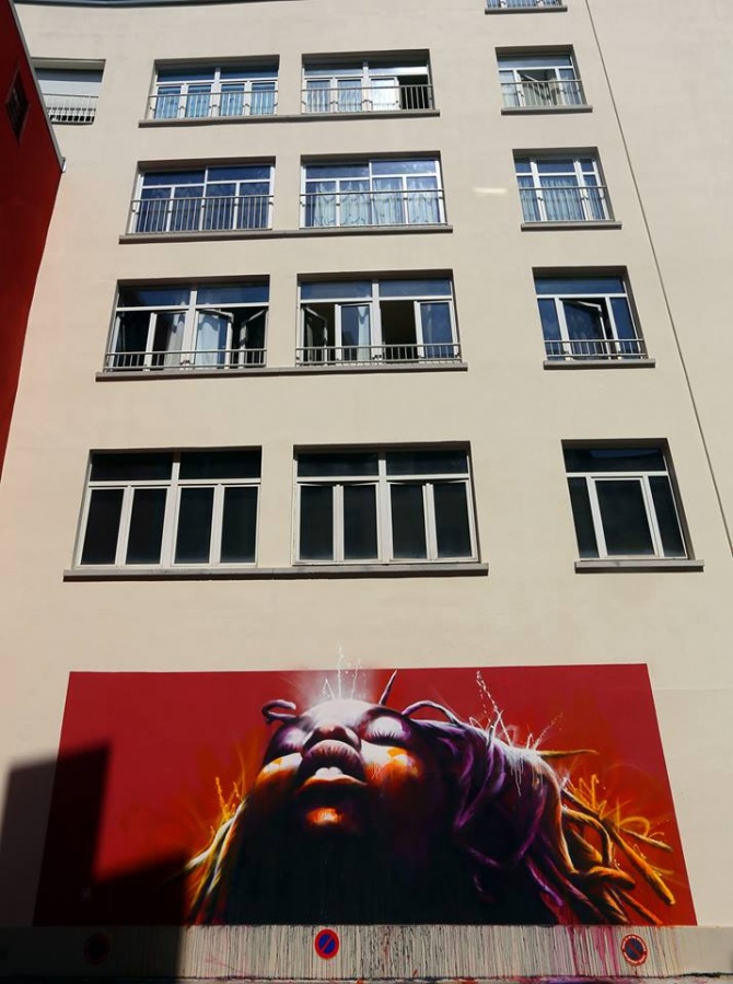 Emanation du M.U.R. d’Oberkampf, la célèbre association et manifestation parisienne qui a déjà promue et mis en avant plus d’une centaine d’artistes sur son mur de 24m² (8x3m) situé à l’angle des rues Saint-Maur et Oberkampf (Paris, 11e), le M.U.R. de Mulhouse est porté et soutenu par l’association culturelle Epistrophe. Il s’agit en fait du deuxième « mur » réalisé dans la ville alsacienne ; le premier ayant été inauguré en juin dernier par le street artiste parisien Marchal Mithouard, alias SHAKA. L’oeuvre de SHAKA située au passage Teutonique dans le centre de Mulhouse est finalement devenue permanente pour le plus grand bonheur des protagonistes. Il a donc été décidé de trouver un nouveau « mur », qui lui sera le support d’oeuvres temporaires, pour respecter le concept initial. DAN23 vient donc d’inaugurer de la plus plus belle des manières ce nouvel emplacement situé rue de la Moselle, dans le centre historique de Mulhouse. Cette oeuvre, déjà réalisée sur bois (48,8×43,3cm) en 2013, porte le titre d’une chanson de Diana Ross, « Ain’t No Montain High Enough ». Elle s’affiche maintenant en 8x3m. Le résultat est sublime.