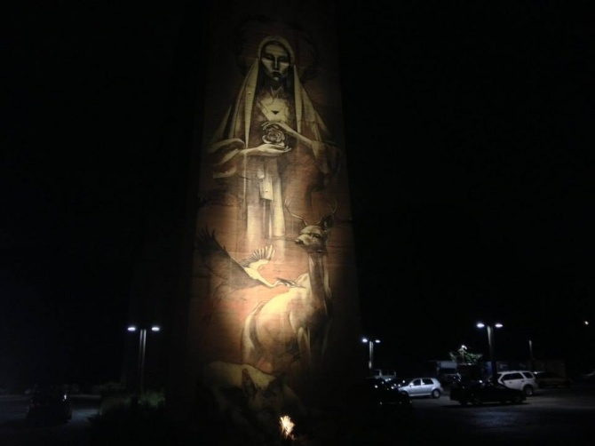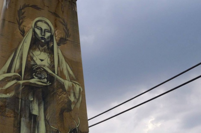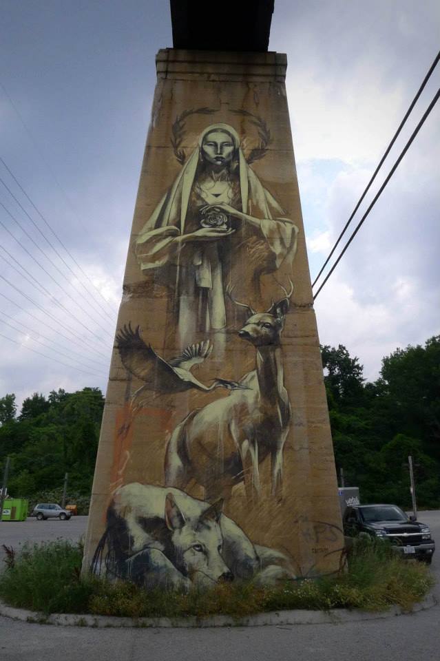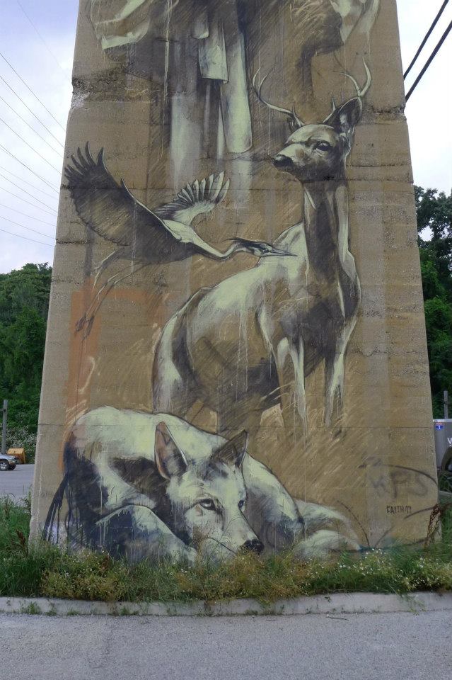 Le pilier du pont sur lequel est réaliser cette oeuvre monumentale est devant Evergreen Brick Works sur l’avenue Bayview. Faith47 était invitée par le Galerie Well and Good.