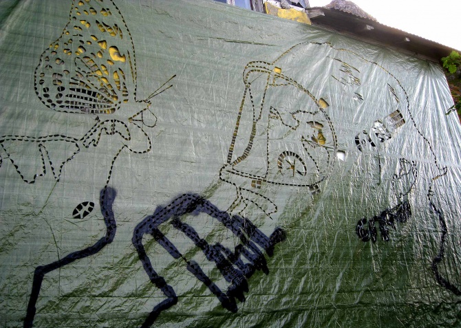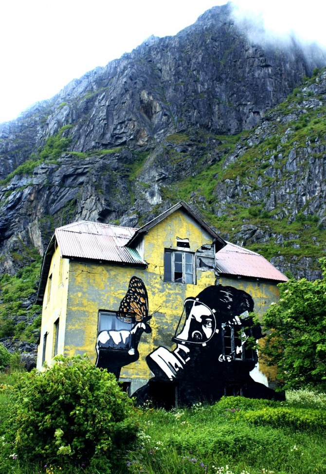 J’adore Pøbel, cet artiste qui a un sens très aiguisé du décalage. Ce pochoir réalisé en pleine nature semble tout droit sortir d’un film de fin du monde. Mais peut-être est-ce le message que veut nous communiquer l’artiste norvégien, familier des oeuvres « à message », qui nous renvoie comme un miroir la dérision de nos propres comportements sur une nature que l’on ne cesse de martyriser. Le masque à gaz peut être ici interprété, à l’image des artistes américains Hygienic Dress League, comme le symbole absurde mais nécessaire d’une protection contre nos propres actes. Cette oeuvre a été peinte par Pobel au pochoir en 2009 dans la campagne norvégienne, à Lofoten précisément.
