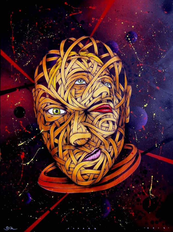 Otto Schade, alias Osch, est un artiste né au Chili en 1971. Architecte de formation, et récompensé en tant que tel, il a toujours été fasciné par la peinture surréaliste et abstraite. Cette passion l’a amené à développer sa propre expérience et son propre talent de peintre, dessinateur, illustrateur, en particulier au travers de nombreux voyages qui sont pour lui des sources d’inspiration. Otto Schade alterne les techniques et les supports. Sa peinture montre un style unique, prouvant une imagination inventive ainsi qu’une technique précise et raffinée. Ses « tissages » sont devenus une marque de fabrique. On les retrouve sur différents supports : Tableaux ou murs. Otto peint principalement à la peinture à l’huile mais utilise d’autres techniques comme le pochoir, qu’il retouche ensuite au marqueur pour affiner les traits qu’il souhaite vifs et précis. Ce portrait réalisé au pochoir se nomme Personality Disorder et est visible dans le quartier Mitte à Berlin, dans l’impasse Haus Schwarzenberg, au 39 Rosenthaler Straße, celle qui mène au musée d’Anne Frank. L’impasse, un petit musée à ciel ouvert, est dédiée à la création indépendante et est gérée par l’association Schwarzenberg.