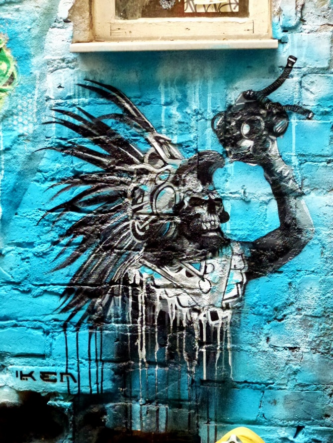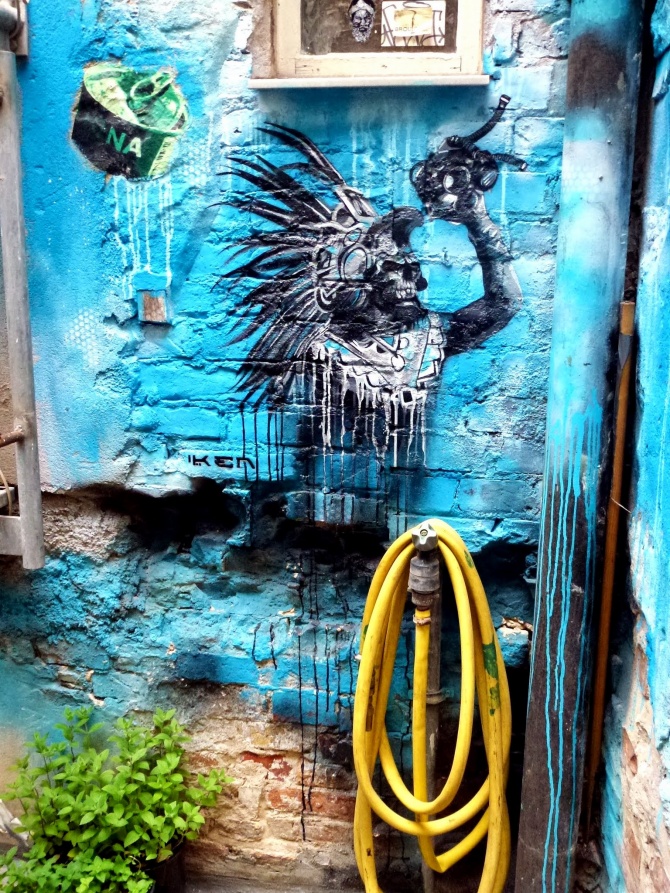 L’art de KEN est indissociable de celui de la rue où les supports sont inséparables de ses oeuvres. Friches industrielles, murs délabrés, zones abandonnées… sont les médiums de son art radioactif. Guerre nucléaire, guerre chimique,… l’art de KEN est un avertissement, un cri contre les risques de notre auto-destruction programmée. Ce pochoir a été réalisé début 2013, tout au fond de l’impasse Haus Schwarzenberg située au 39 Rosenthaler Straße. L’impasse est un lieu dédié à la création indépendante, géré depuis 18 ans par l’association Schwarzenberg, qui se finance par la galerie/boutique Neurotitan. Cette impasse est un véritable musée à ciel ouvert, où l’on peut voir des oeuvres de Osch (Otto Schode), Mimi The Clown, Jimmy.C, Dscreet & REKA, etc…