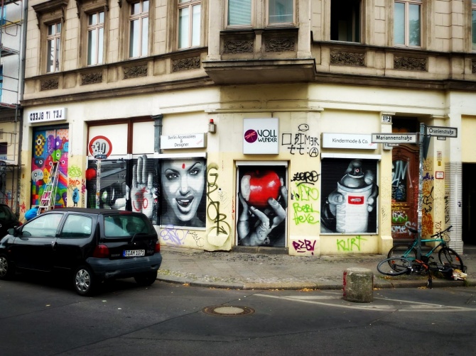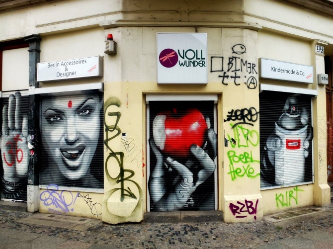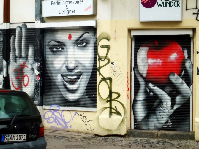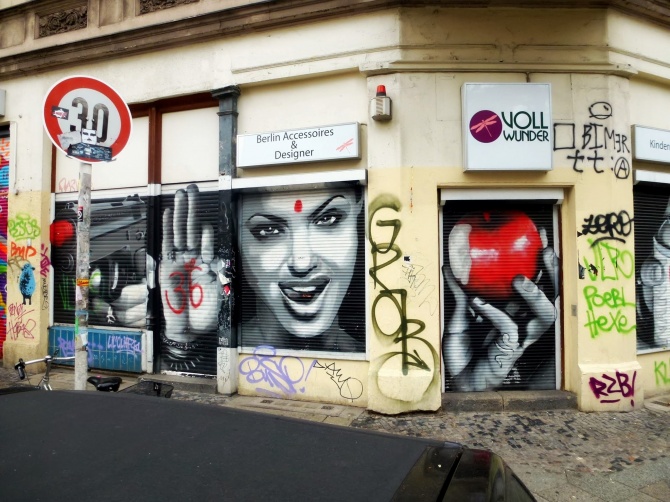 Juste en face du célèbre quadriptyque représentant Jack Nicholson, se trouve une autre oeuvre du street artiste MTO. Il s’agit d’une commande réalisée fin 2008 sur les volets roulants d’un magasin de Heinrichplatz dans le quartier Kreuzberg, le Wild Fremd Store à l’époque remplacé aujourd’hui par un magasin de vêtements. Ce triptyque représentant l’actrice Angélina Jolie en déesse Shiva, dont l’une des mains (Shiva en a plusieurs) tient un revolver faisant feu sur Jack se trouvant juste an face, devait au départ représenter la chanteuse Nina Hagen. MTO explique dans une interview donnée au site Fatcap que son projet initial aurait dû s’appeler « Shiva HAGEN » : « Shiva JOLIE » était originalement faite pour être « Shiva HAGEN » avec Nina Hagen en shiva complètement déjantée et sur-maquillée se bagarrant avec Jack Nicholson, placé en face, de l’autre coté de la rue, mais la propriétaire du magasin ayant refusée et voulue Angelina JOLIE … il a fallu s’adapter ! » – Le résultat reste cependant épatant. A noter que pour voir cette oeuvre, il faut s’y prendre un jour de fermeture du magasin, le dimanche par exemple. Ce dimanche 14 juillet a été choisi par la jeune artiste Billy & Alex pour peindre le volet roulant du magasin situé juste à gauche du triptyque de MTO (photo ci-dessous)