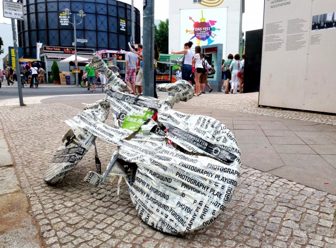 Tape Art ou simple joke, ce vélo est habillé pour l’hiver. Le Tape Art est cette pratique qui consiste à réaliser des oeuvres, des installations, des performances avec du ruban adhésif. L’un des maîtres en la matière, Max Zorn, réalise avec du ruban adhésif brun des performances artistiques absolument incroyables. Ce vélo situé au Check Point Charlie à Berlin ressemble plus à une installation inspirée par Christo et Jeanne-Claude ou par un esprit facétieux.