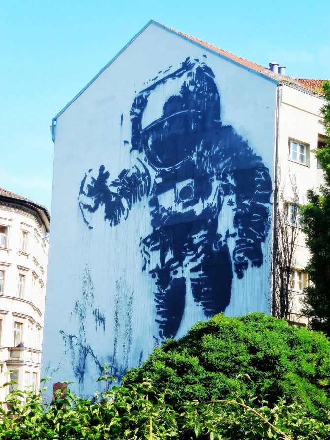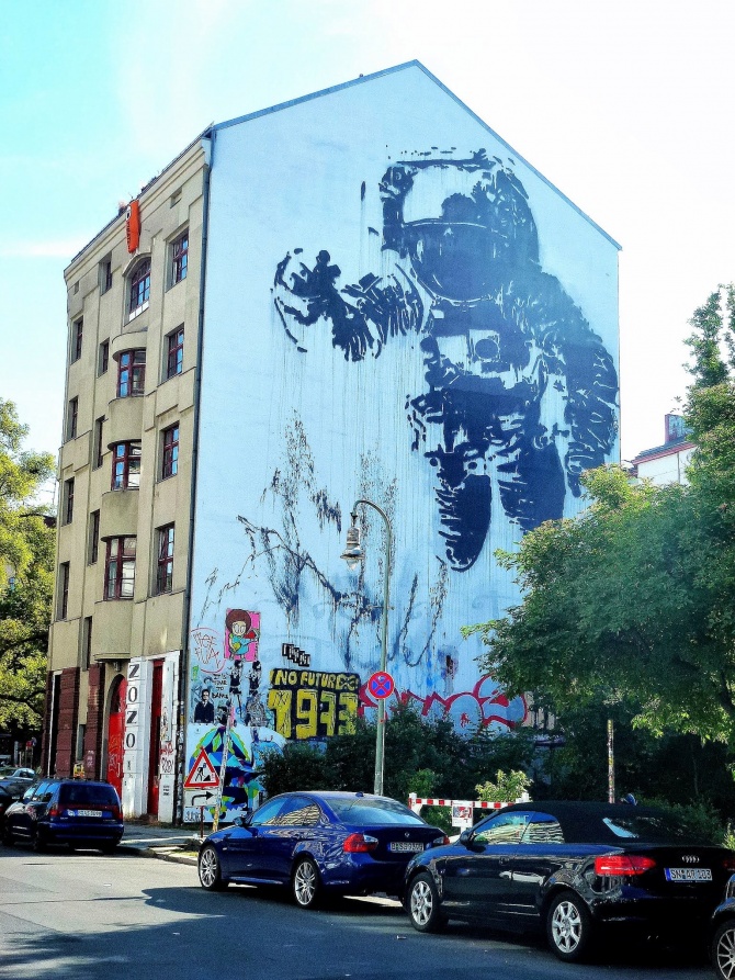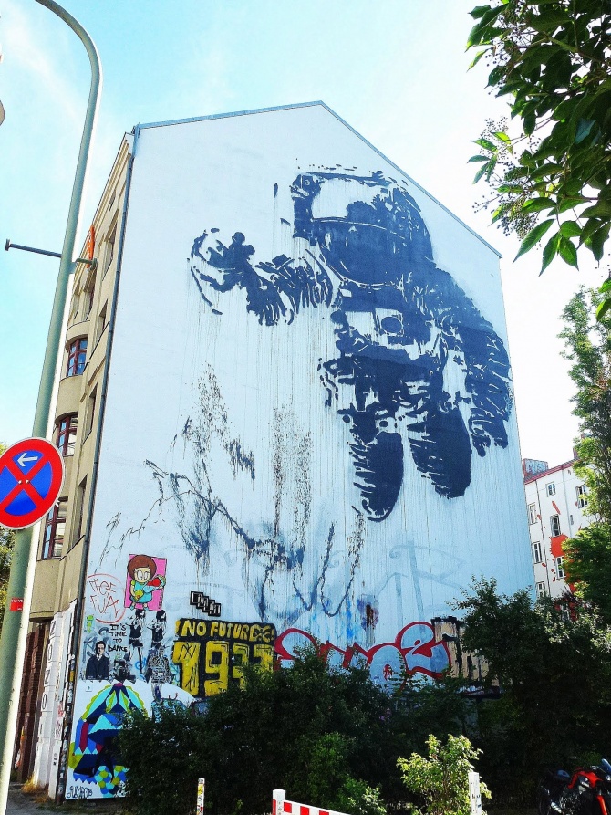 Le cosmonaute flottant peint par l’artiste français Victor Ash en 2007 est aujourd’hui l’une des oeuvres de street art les plus connues de Berlin, peut être même la plus célèbre parmi toutes. Cette pièce monumentale est une commande de la ville, qui déjà en 2007, souhaitait renforcer le caractère artistique et libertaire de cet art de rue qui aujourd’hui fait la notoriété mondiale de cette capitale de l’art urbain. Situé sur Mariannenstrasse, à quelques dizaine de mètres de Heinrichplatz (là où MTO a réalisé plusieurs peintures), ce cosmonaute met en apesanteur le quartier de Kreuzberg.