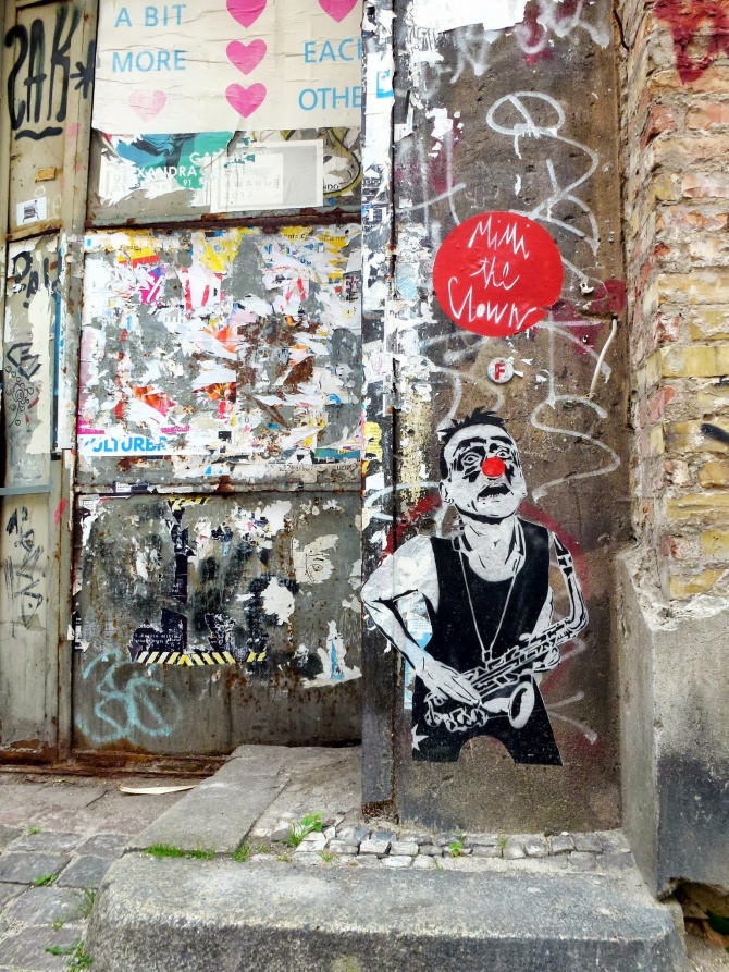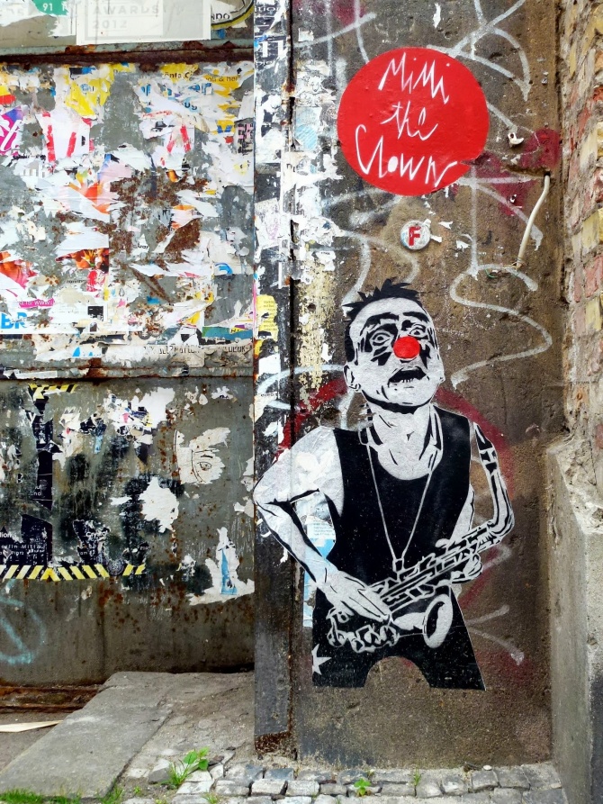 Ce « Jimmy Jazz » collé par Miguel Donvez, alias MIMI the ClowN, vient compléter le Rock’n’Roll Band berlinois de l’artiste lillois. Après les guitaristes collés sur la façade de l’ancien squatt Tacheles et à côté du musée de la DDR au bord de la Spree, et le saxophoniste collé dans l’impasse Haus Schwarzenberg, MIMI the ClowN a continué d’investir la capitale allemande avec ses collages facétieux toujours placés dans des endroits dédiés à l’art ou au street art. Ce saxophoniste est collé à l’entrée d’un immeuble sur Auguststrasse, dans le quartier de Mitte, c’est à dire en plein coeur de la plus forte densité de galeries d’art contemporain de la ville. Bien vu Miguel !