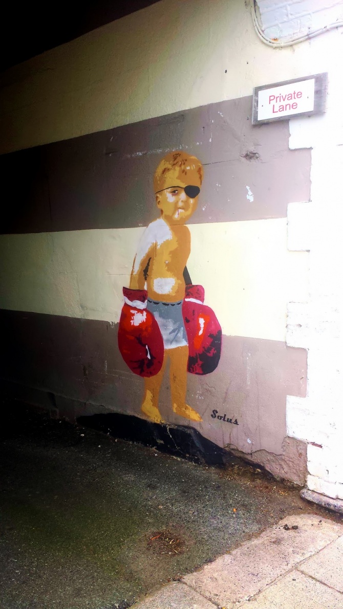 Solus est un artiste irlandais basé à Dublin, qui travaille au pochoir, à la bombe aérosol et à l’acrylique. Je découvre la scène du street art irlandais, et en particulier celle de Dublin, grâce au photographe Ken Heffernan, qui pour mon plus grand plaisir alimente ma boîte mail de photos prises au fil de ses découvertes dans la capitale irlandaise. Solus est un artiste autodidacte qui travaille surtout au pochoir. Influencé par le pop art et l’art des tatouages traditionnels, sa peinture est populaire, colorée, et un brin impertinente. Solus, qui signe ses oeuvres par $olus, peint des enfants tatoués, borgnes, avec parfois la cigarette au bec. Il s’amuse également du support et du lieu où il peint, comme sur cette pièce réalisée juste à l’entrée d’une voie privée. Cet enfant aux gants de boxe a la posture du gardien des lieux et semble nous dire, « pour passer, il va d’abord falloir me passer dessus ». Merci Ken pour cette belle découverte.