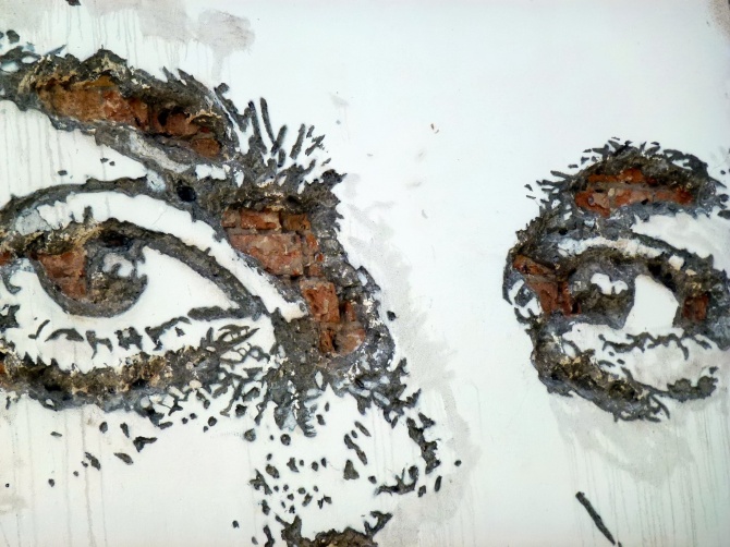 Même si la pièce reste importante et s’inscrit pleinement dans l’art urbain, on s’éloigne cependant un peu de l’esprit du street art, à savoir un art alternatif et libre, un art qui s’affranchit de toutes formes de reconnaissance pour pouvoir s’exposer et se partager avec le public, un art qui souvent par son message nous renvoie à des questions importantes de la société, un art qui s’oppose au consumérisme, etc… Mais bon, il faut bien que les artistes vivent aussi, et gagnent leur vie de leur art pour mieux encore pouvoir s’exprimer. Ce n’est pas la plus belle oeuvre de Vhils que j’ai eu l’occasion de voir, peut-être que le coeur n’y était pas non plus de son côté ?