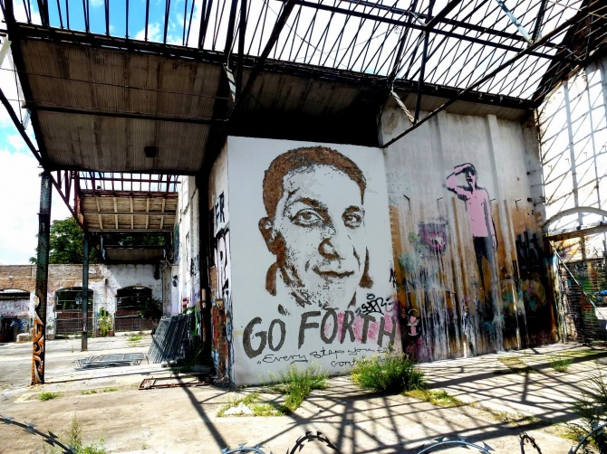 Connu mondialement pour ses œuvres incroyables, l’artiste portugais Alexandre Farto, alias Vhils, est aussi l’objet du certaine discorde dans le monde du street-art. Même si son talent est immense et incontesté, Vhils est l’objet de toutes les convoitises et en particulier celle des compagnies internationales qui cherchent au travers du street art un vecteur de communication pour mieux atteindre leurs clients et leurs marchés. Cette pièce qui porte la légende « Go Forth« , que l’on pourrait traduire par « aller de l’avant », a été réalisée dans l’un des hauts lieux de l’art alternatif berlinois, le RAW Tempel (lire le billet sur ce lieu étonnant). Il s’agit en fait d’une campagne promotionnelle pour la marque Levi’s, dont l’un des slogans est « Go Forth ». Quatre murs ont ainsi été « défoncés » dans Berlin, avec à chaque fois le même thème, reproduire le visage d’une personnalité reconnue pour ses actions culturelles et communautaires. La vidéo réalisée pour l’occasion par Levi’s est assez impressionnante (voir à la fin de ce billet) et met en scène les murs réalisés par Vhils à grands coups d’effet spéciaux et d’explosions. Un beau résultat visuel, scénarisé comme une bande annonce de blockbuster hollywoodien.