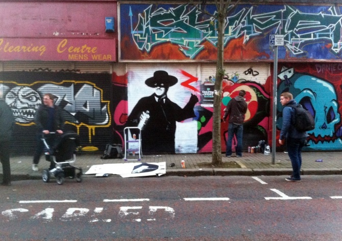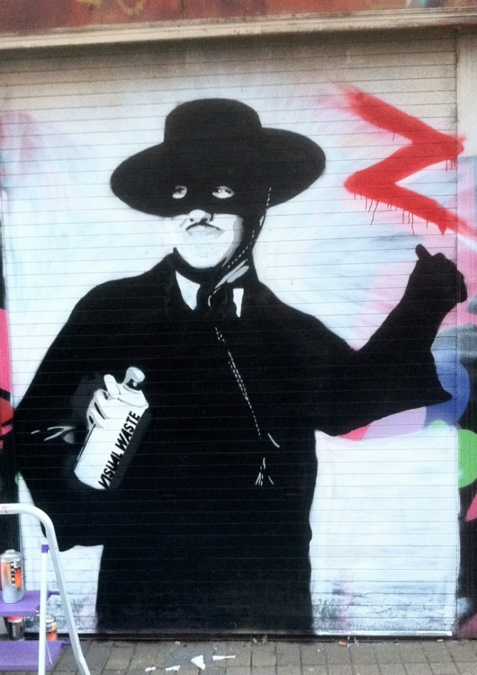 Visual Waste est un street artiste irlandais, qui vit et travaille à Belfast. Son art est celui du pochoir, qu’il réalise souvent en grande dimension, avec des personnages à taille humaine, porteurs de messages socio-politiques. Contours nets, monochromes percutants, messages clairs, Visual Waste fait partie de cette scène de street artiste qui s’inspire de ce que les gens prennent pour acquis en abandonnant leur esprit critique. « it’s better to burn out than to fade away » (que l’on pourrait traduire par « crever d’épuisement vaut (-il) mieux que disparaitre (?) » ; le burn out est un syndrome d’épuisement professionnel, une pathologie des temps modernes ) est l’un des messages qu’il laisse sur les murs de sa cité. Ce Zoro héros des temps nouveaux qui sauve la cité de la pointe de sa bombe aérosol a été peint le 21 septembre 2012, à l’occasion du projet Shutter Scape (Paysage de Volets). Cet évènement artistique organisé par Seedhead Arts et This Means Nothing dans le cadre de la Culture Night avait pour objectif de redonner vie à une partie du centre de Belfast laissée à l’abandon et aux tags sauvages. Les artistes avaient un run de plusieurs heures pour repeindre les volets roulants des magasins situés dans North Street et Garfield Street. Visual Waste aime prendre le spectateur à contre-pied, et comme il pourrait nous le laisser croire, son empreinte n’a en réalité rien d’un déchet visuel, bien au contraire.
