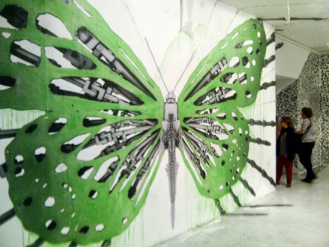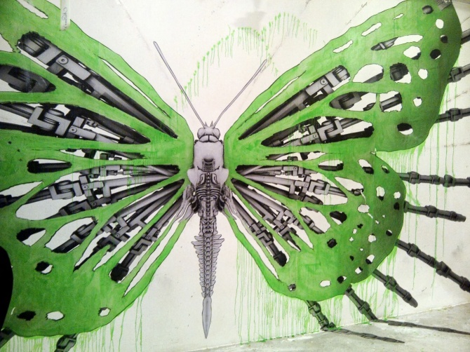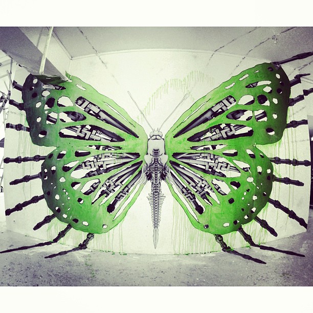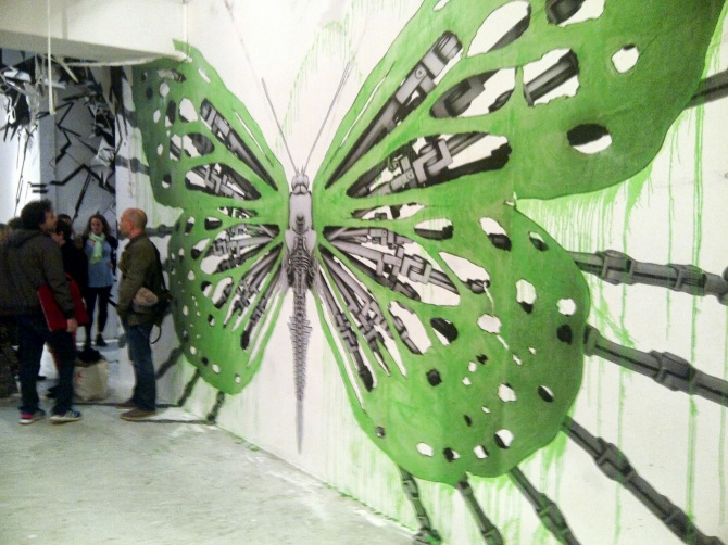 Ce papillon hybride peint par le street artiste Ludo pour l’exposition « Etat des Lieux » s’amuse des supports de la galerie du jour. L’insecte mutant étend ses ailes et ses pattes au delà des murs. Ludo est un artiste originaire de la banlieue parisienne, dont la légende « Nature’s Revenge » lui colle à la peau. Ses interventions urbaines font naitre sur les murs des villes des animaux mutants verts acidulés, mi organiques, mi robotiques. Respectons la nature et ne jouons pas aux apprentis sorciers ; L’art de Ludo est engagé et aspire à nous secouer, à nous rappeler sans cesse notre propre fragilité.