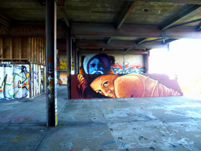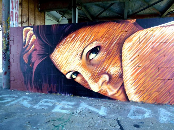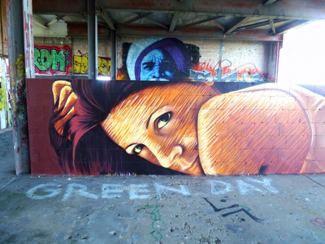 Ce billet est un peu particulier ; c’est le 300ème écrit sur street-art-avenue. J’ai choisi de parler pour l’occasion d’un mur que j’ai photographié en juillet dernier, un mur de JBAK , le duo américain qui vit et travail à Berlin. Pourquoi JBAK ? Tout simplement parce que j’aime leur travail, parce que j’ai eu un coup de foudre pour le lieu où cette oeuvre à été réalisée ; l’ancienne base d’écoute de la NSA située sur la montagne artificielle de Teufelsberg (La montagne du diable) ; et enfin, parce que Karl Addison, membre fondateur du duo JBAK est un artiste extrêmement sympathique. J’ai eu la chance de le rencontrer lors de mon séjour dans la capitale allemande et je suis tombé sous le charme de son travail, de sa gentillesse et de sa simplicité. Cette oeuvre peinte à 4 mains en 2012 lors du festival Artbase mélange les deux styles de Karl Addison et de James Bullough. Ciselé pour l’un, photo réaliste pour l’autre. Ce visage féminin qui se prénomme « Antoniya » se trouve dans la perspective d’un autre mur du duo JBAK, « Old Man« , également réalisé dans le cadre du festival Artbase 2012.