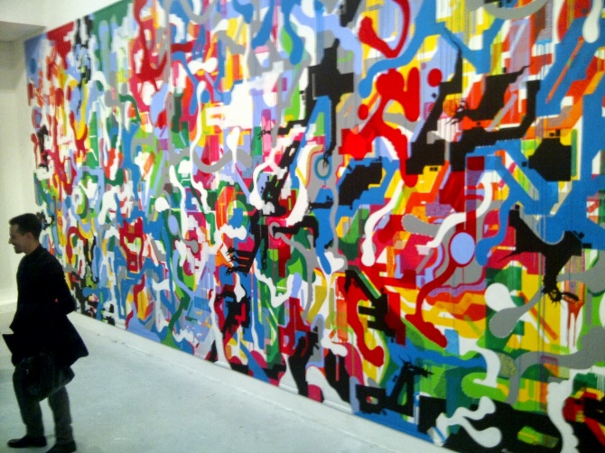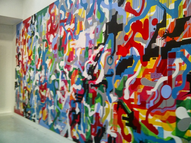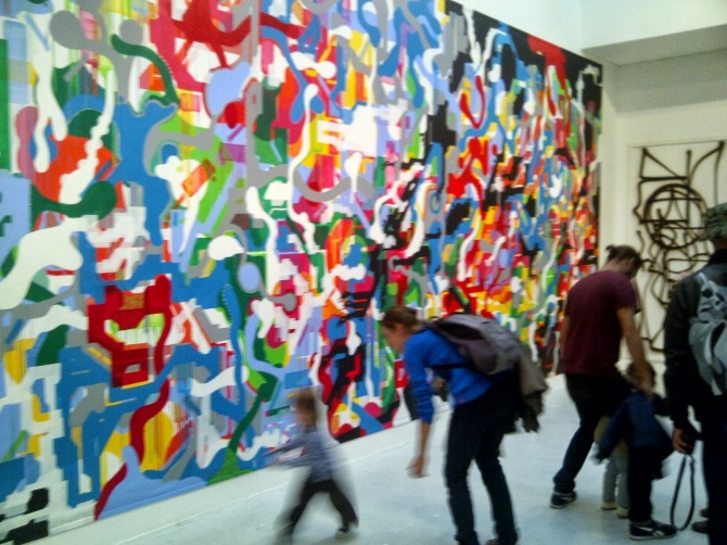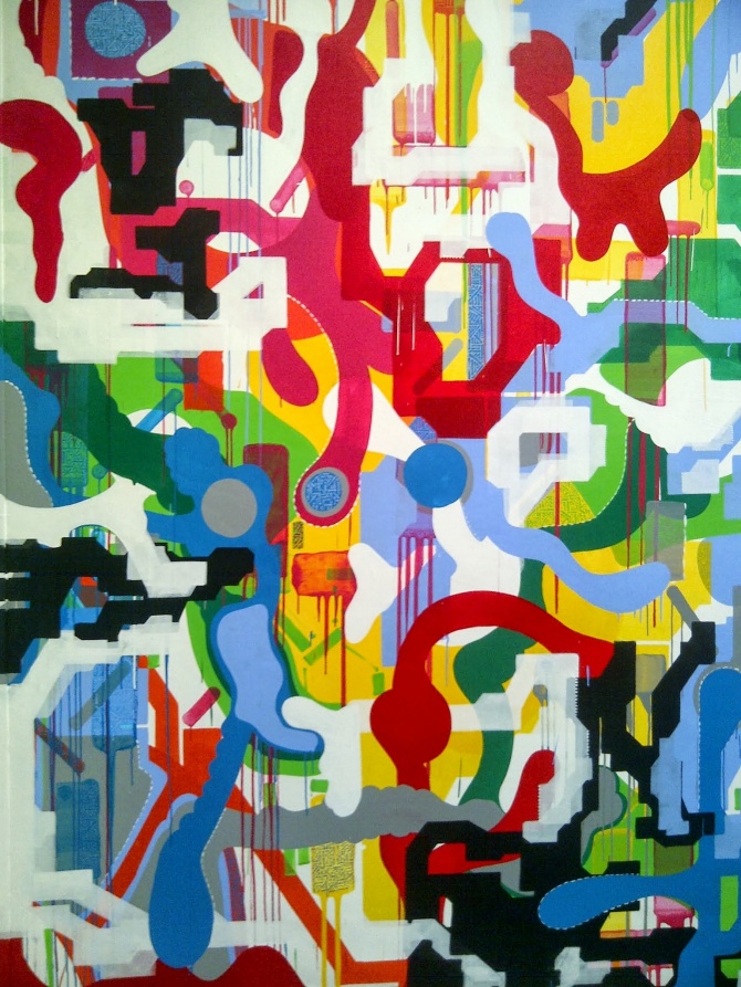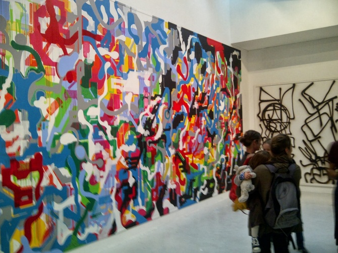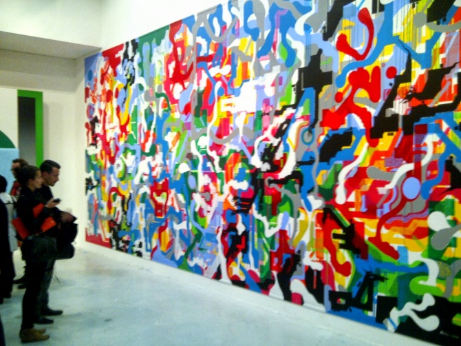 Parmi les oeuvres exposées, l’une des plus importantes en dimension est celle réalisée à 6 mains par les artistes Jonone, Lek & Sowat. L’artiste américain Jonone est l’un des acteurs majeurs du street art, mondialement reconnu pour ces tags calligraphiques, ces peintures abstraites et son style répétitif. Ses oeuvres sont vendues plusieurs dizaines de milliers d’euros dans les ventes aux enchères, faisant de lui l’un des artistes très recherchés par les collectionneurs et amateurs d’art contemporain. Son association avec le duo Lek & Sowat est riche en couleur et en vivacité. Cette toile abstraite de 24 m² est impressionnante, pour les yeux mais aussi pour le portefeuille. Avis aux amateurs, pour l’avoir dans votre salon, il vous faudra débourser 70 000€ … Quand le street art rentre dans les galeries, cela peut avoir un prix.