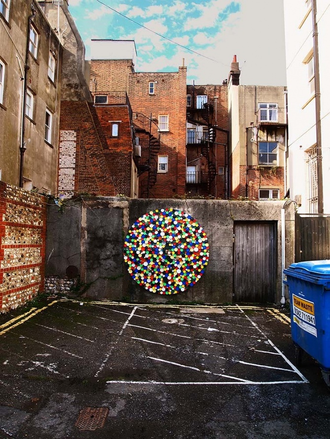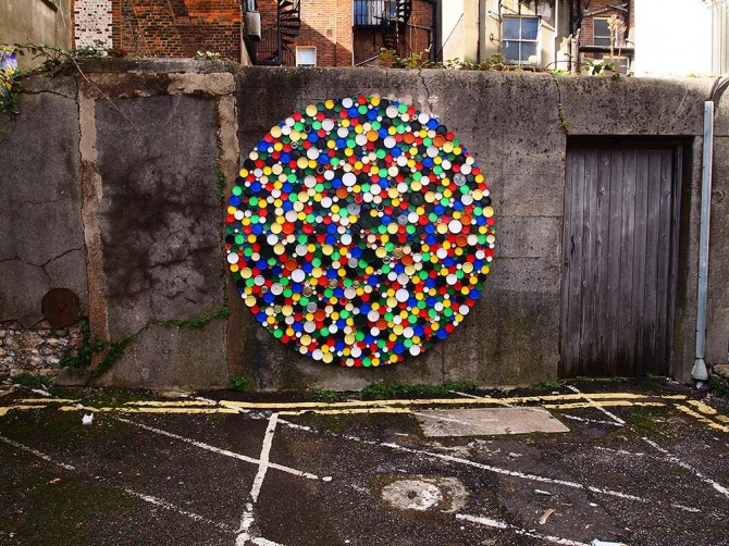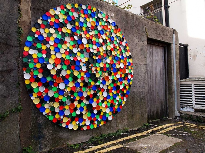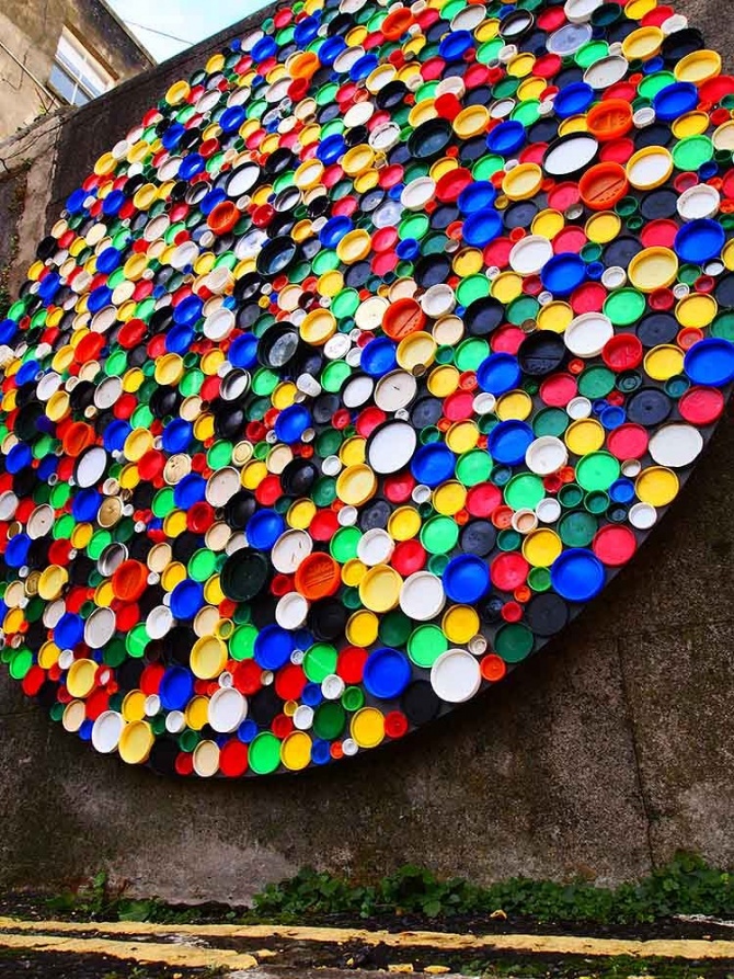 Cette roue des couleurs a entièrement été réalisée avec des bouchons de bouteilles et de pots. r1. a également pas mal voyagé en Europe où il a laissé plusieurs traces de son passage. N’hésitez-pas à nous faire parvenir vos photos si vous croisez l’une de ses œuvres. Je ne sais pas vous, mais moi je suis fan.