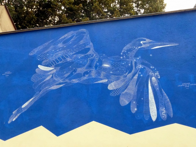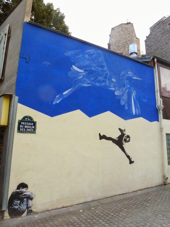 Le passage du Moulin des Près, dans le quartier de la Butte-aux-Cailles (Paris 13ème), est l’un des nombreux « spots » où les artistes invités par l’association « Lézarts de la Bièvre » laissent chaque année la trace de leur participation. Trois artistes ont peints dans ce passage : Jef Aéorosol en 2006, Jana & JS en 2009 et Philippe Baudelocque. Ce dernier était l’invité des Lezarts de la Bièvre en juin 2012. L’artiste est fortement inspiré par la nature, ce qui explique que les animaux sont au coeur de son projet artistique, que ce soit dans la rue où en galerie. Même si Philippe Baudelocque refuse l’étiquette de « street artiste », son art trouve sur les murs des villes des supports qui subliment son talent. Cet oiseau dessiné à la craie semble prêt à prendre son envol dans les rues parisiennes.