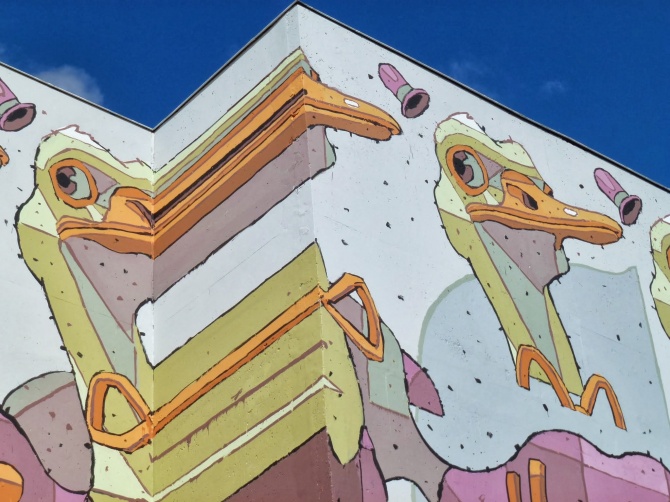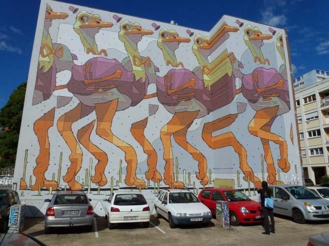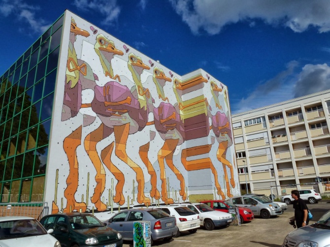 Les autruches de Aryz ont une place de choix, bien visibles par tous les passagers du TGV et du TER qui utilisent cette voie ferrée, point de passage obligé pour rentrer en Bretagne. Cette oeuvre est incontestablement l’une des plus importantes réalisées dans la métropole rennaise à ce jour (avec celle peinte par SETH sur l’avenue de la Bataille Flandres-Dunkerque et celle de Mioshe au 101 Boulevard de Verdun). Le choix d’autruches dansant le french cancan est assez étonnant et très décalé dans ce quartier relativement impersonnel. Un bestiaire qui interpelle à coup sûr et attire l’oeil.