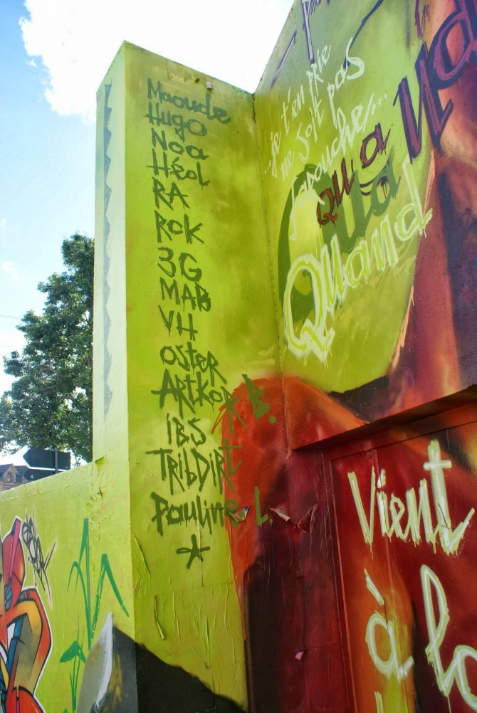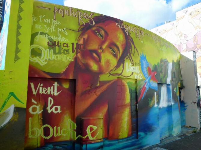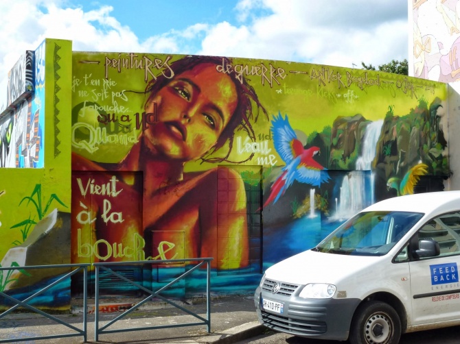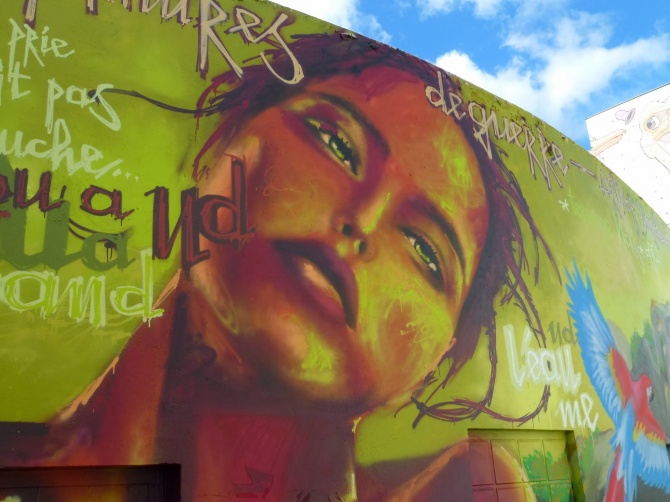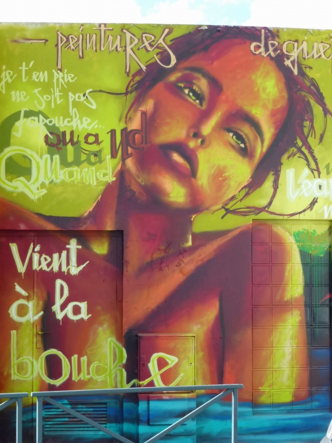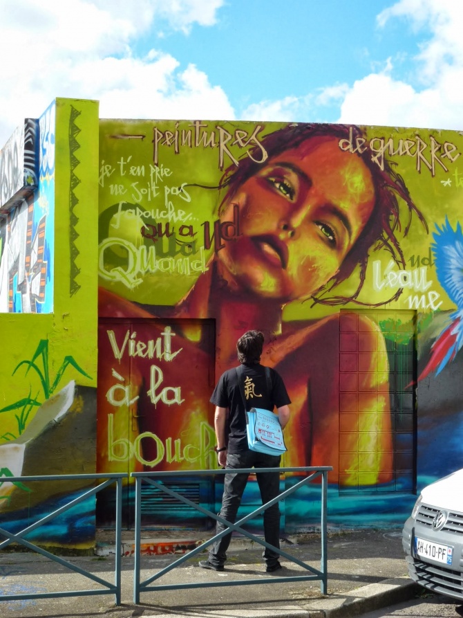 Renseignement pris, Peinturesdeguerre est un street artiste rennais qui « écrit sur la ville sérieusement comme un jeu d’enfant ». Son nom est un clin d’oeil à ses racines maoris, un peuple de guerriers, et au tatouage polynésien, la peinture de guerre ultime. Paradoxalement, je trouve sa peinture sensible, pleine de douceur, à l’image de ce portrait de femme. Ce visage est l’un des éléments qui composent une fresque aux dimensions importantes réalisée par un collectif d’artistes (voir la dernière photo). Peinturesdeguerre a signé son oeuvre par les paroles de la chanson « L’Eau à la Bouche », écrite par Serge Gainsbourg en 1959 : « Je t’en prie ne sois pas farouche quand me vient l’eau à la bouche ». La suite de la chanson ; « Je te veux confiante, je te sens captive – Je te veux docile, je te sens craintive » ; n’a pas été écrite mais peinte par l’artiste.