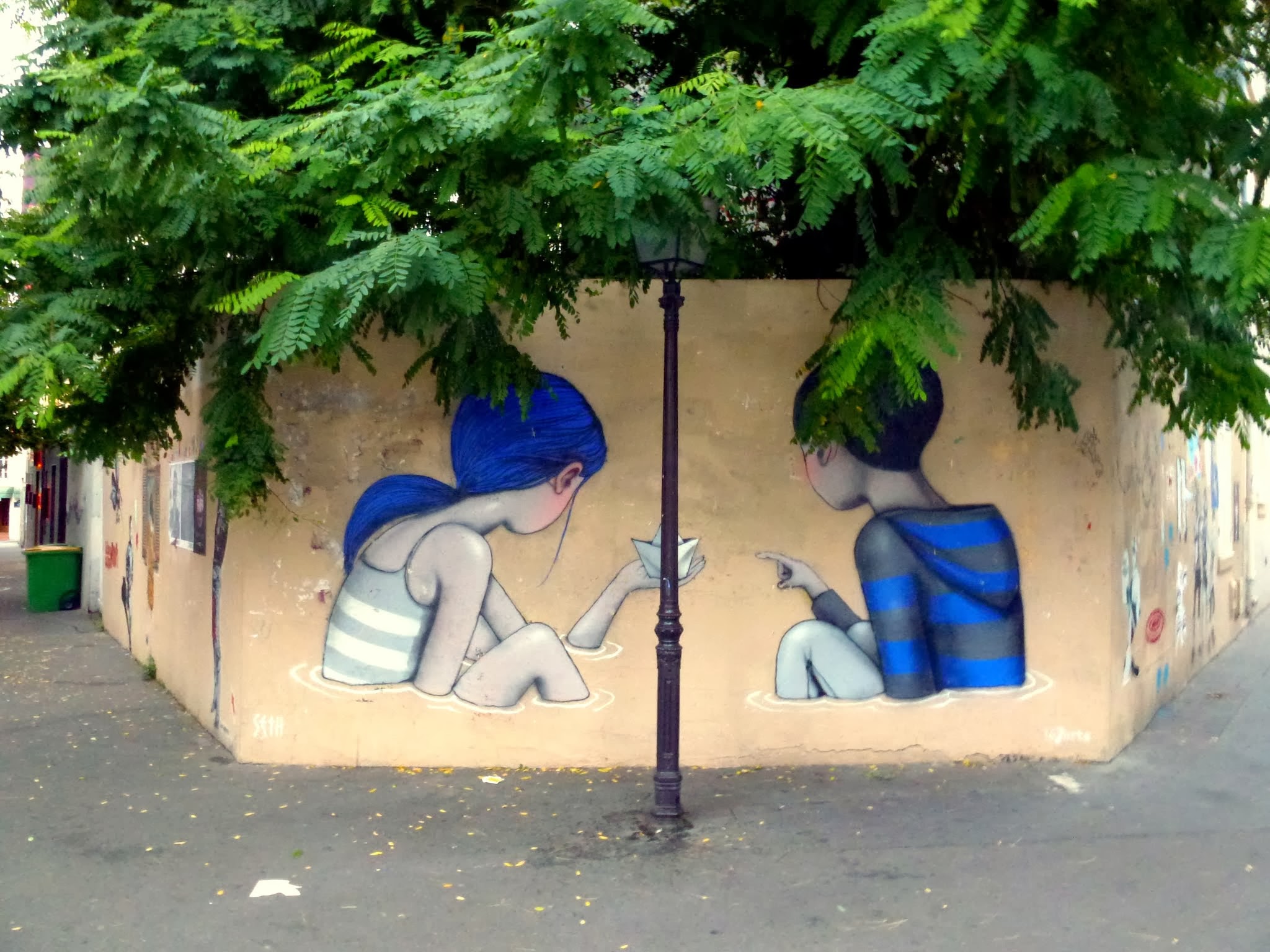 Julien Malland, le GlobePainter, plus connu sous son nom d’artiste SETH, était la guest star 2013 de la manifestation « Lézarts de la Bièvre ». Chaque année, un artiste suit le parcours de l’affluent souterrain de la Seine (la Bièvre) et laisse en surface, au gré des murs disponibles et de son inspiration, des oeuvres pour promouvoir les ateliers d’artistes qui jalonnent le parcours entre les 5ème et 13ème arrondissements parisiens. Après l’enfant peint dans le passage Boiton, on retrouve SETH place de la Commune de Paris, dans le quartier de la Butte-aux-Cailles. Comme toujours, la peinture de SETH est très poétiques et sensible. Ces deux enfants semblent baigner dans un monde d’insouciance et de rêverie. Le bleu vif et profond renforce ce sentiment de tranquillité. Ce mur est très touchant.