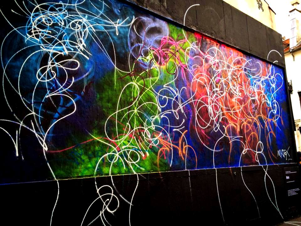 L’artiste Nuno de Matos, alias MATOX, a fait le MUR Oberkampf le 23 novembre dernier. Durant deux semaines et jusqu’au 14 décembre, les 24 m² du MUR situé à l’angle des rues Saint Maur et Oberkampf (Paris 11) se sont illuminés du talent et du style abstrait lyrique de l’artiste luso-français. MATOX se dit influencé par l’art et la pensée de George Mathieu qui disait « Seule la rapidité de l’action permet de saisir et d’exprimer ce qui émane des profondeurs de l’être sans que son éruption spontanée soit réprimée et modifiée par une réflexion et une intervention rationnelles« . Rapidité et rythme, style fluide et épuré, inspiration calligraphique.. cette splendide partition de lumière me fait penser à une oeuvre de light painting : Lumineuse.