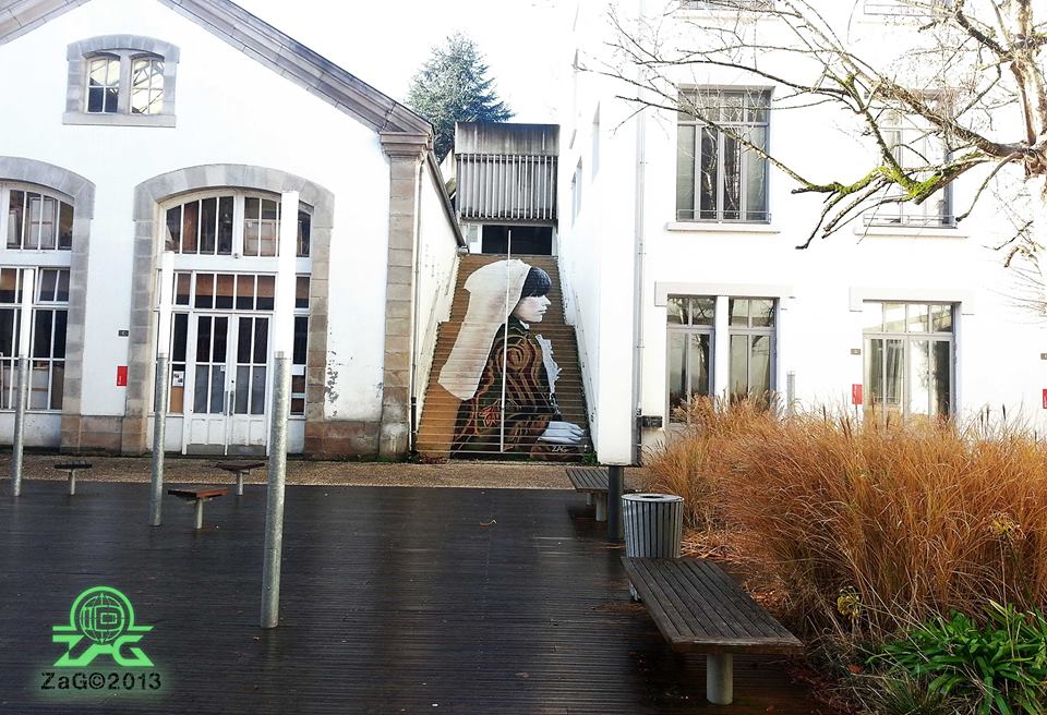 Ce sont les escaliers de l’ancienne Manufacture des Tabacs qui sont cette fois la toile urbaine de son oeuvre. « La Morlaisienne – La Renaissance » est une splendide anamorphose représentant une jeune femme en habits traditionnels. Le lieu étant la propriété de la communauté de communes, les élus de la ville n’auront ici pas de recours direct possible, sauf à « pousser » les élus des communes locales et demander l’effacement de l’oeuvre.