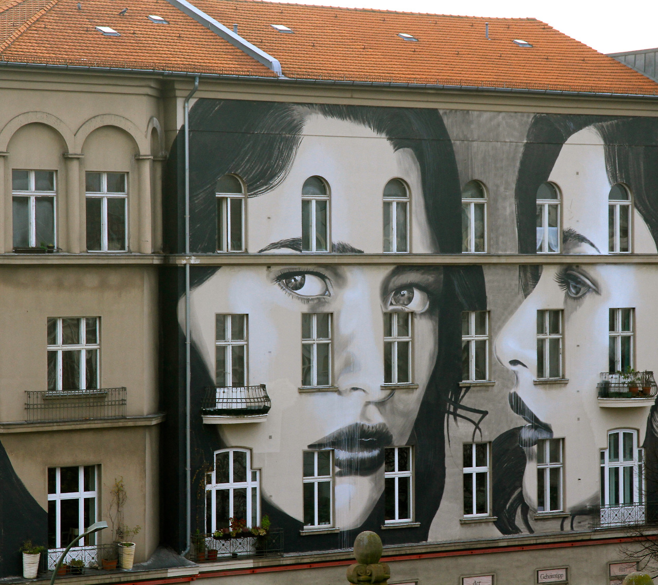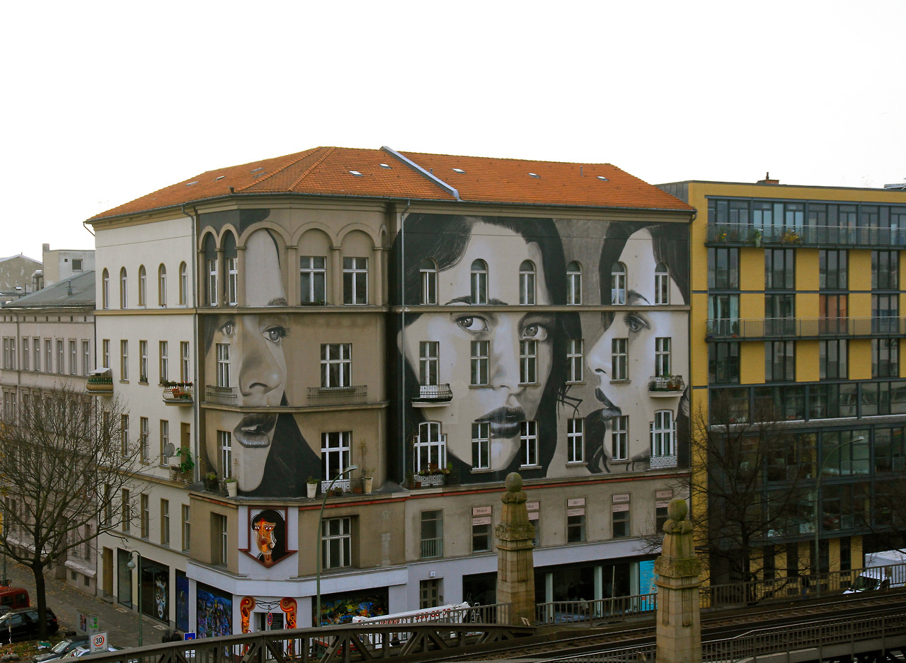 RONE a peint trois magnifiques portraits dans un ton sépia sous 3 angles différents. Le résultat est impressionnant, tant par ses dimensions que par son intégration dans le paysage de Berlin. Il s’agit d’une des plus grandes oeuvres jamais réalisées par l’artiste qui aura nécessité, pour lui et son équipe, prés de 5 jours de travail. Le photographe norvégien Henrik Haven était sur place pour capturer le travail de RONE. Un grand merci à lui pour le partage des photos. L’oeuvre est visible dans le quartier de Schöneberg, sur Nollendorfplatz.