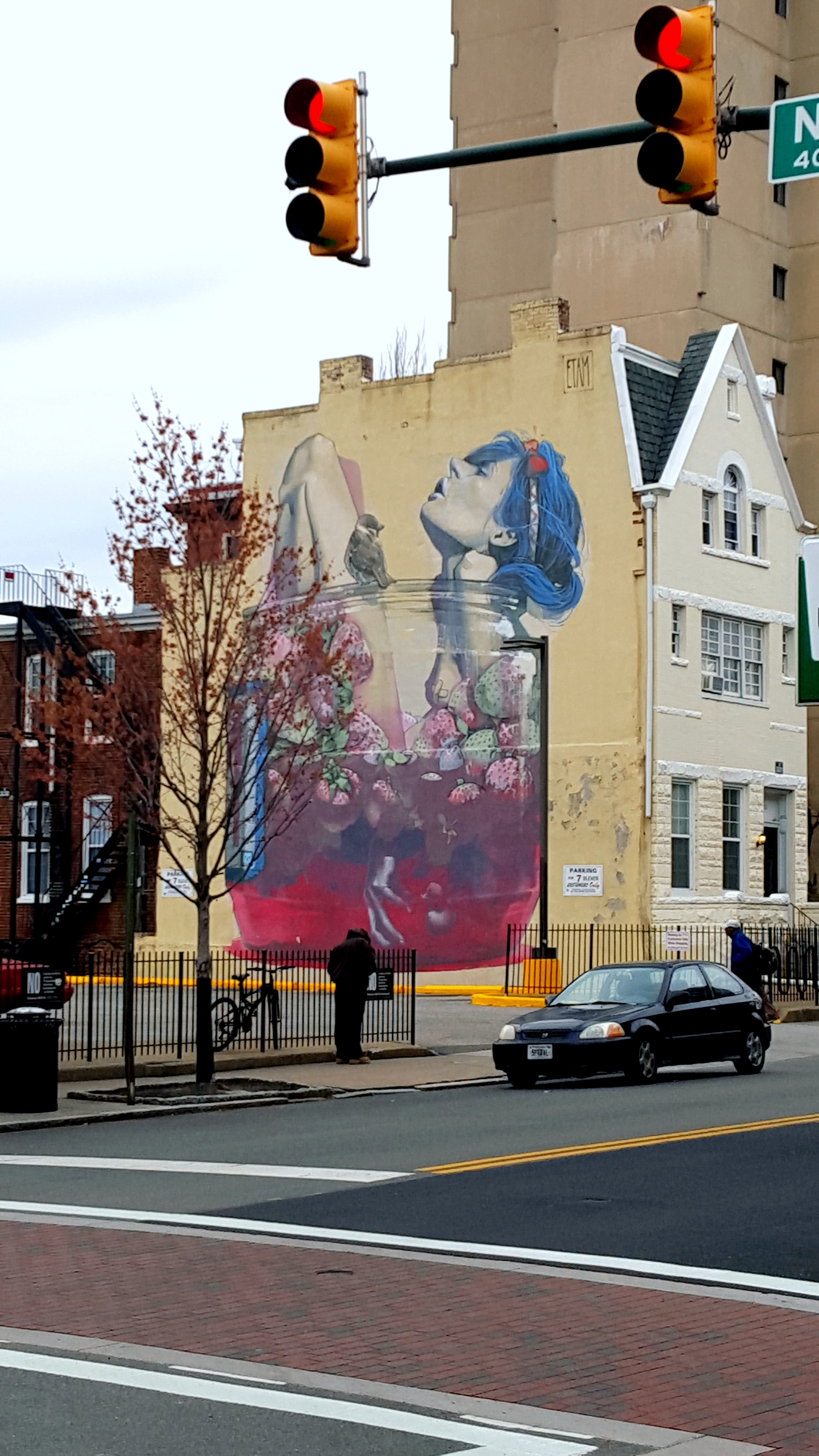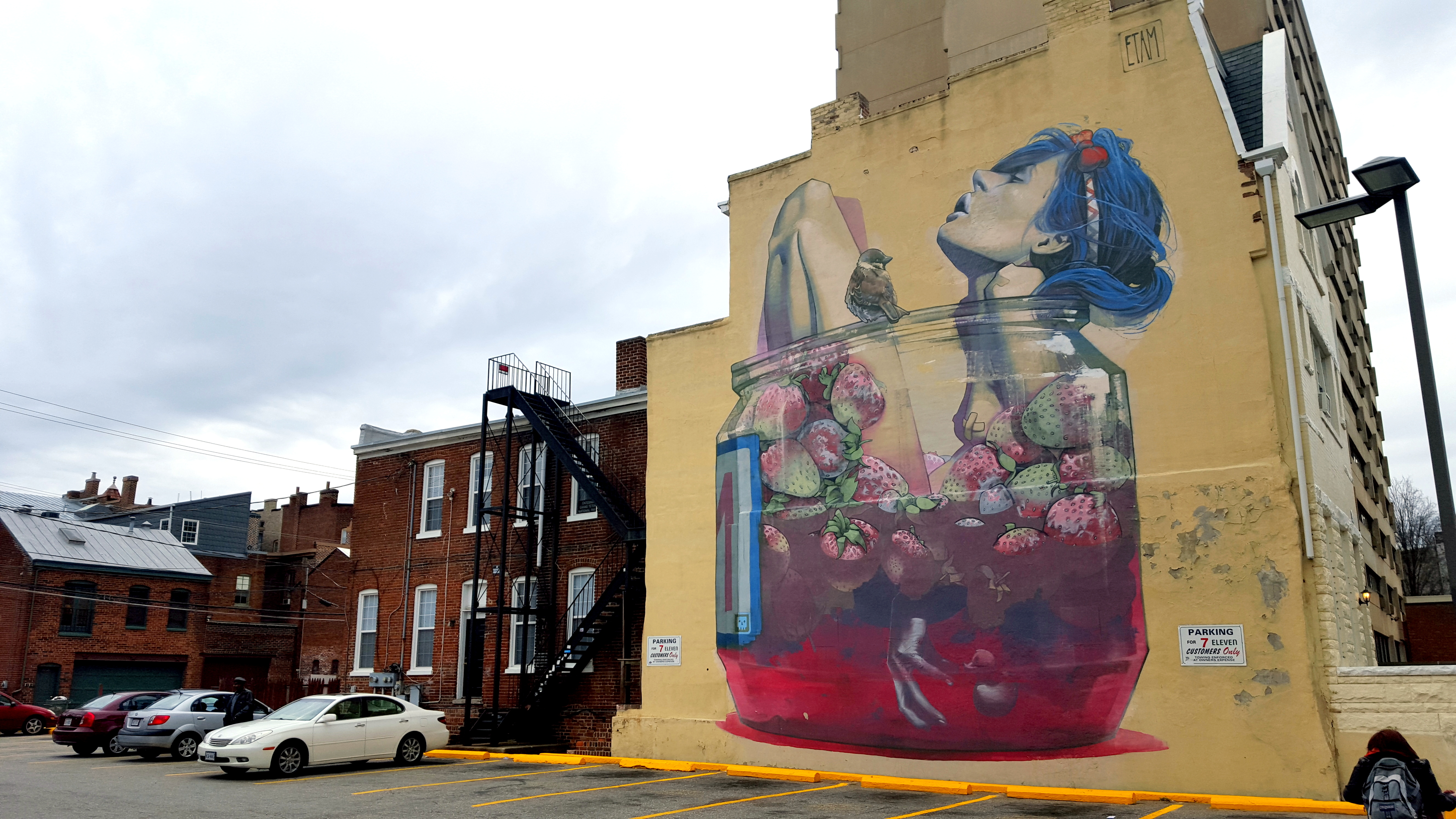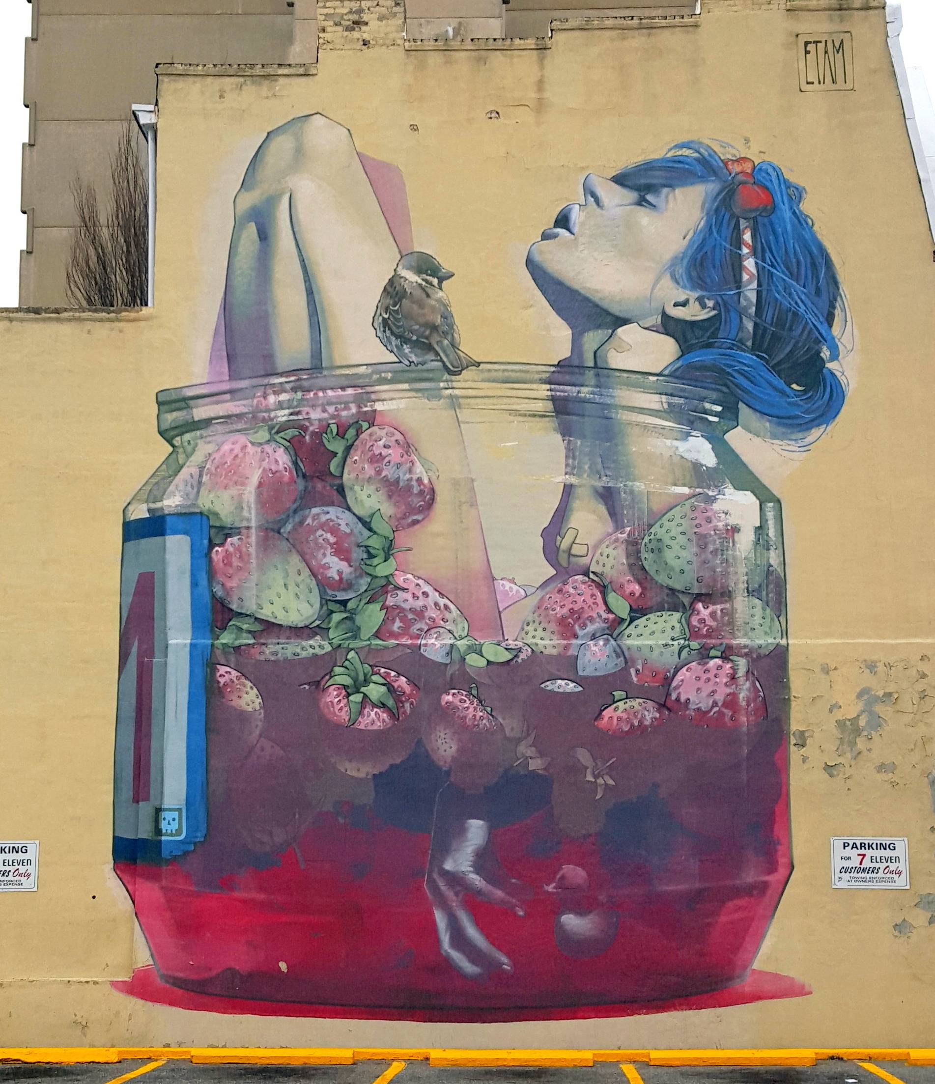 Moonshine (traduction : alcool de contrebande) est le titre de cette pièce du duo polonais Etam Cru. Oeuvre d’une femme hyper sexy prenant son bain avec son petit canard à portée de main, dans un bain de fraise. L’une des plus belles œuvres, par la qualité de son dessin, des détails et couleurs, qu’il nous ait été donné de voir. Réalisée pour le Richmond Mural Project, en 2013 (Richmond – Virginie – USA)