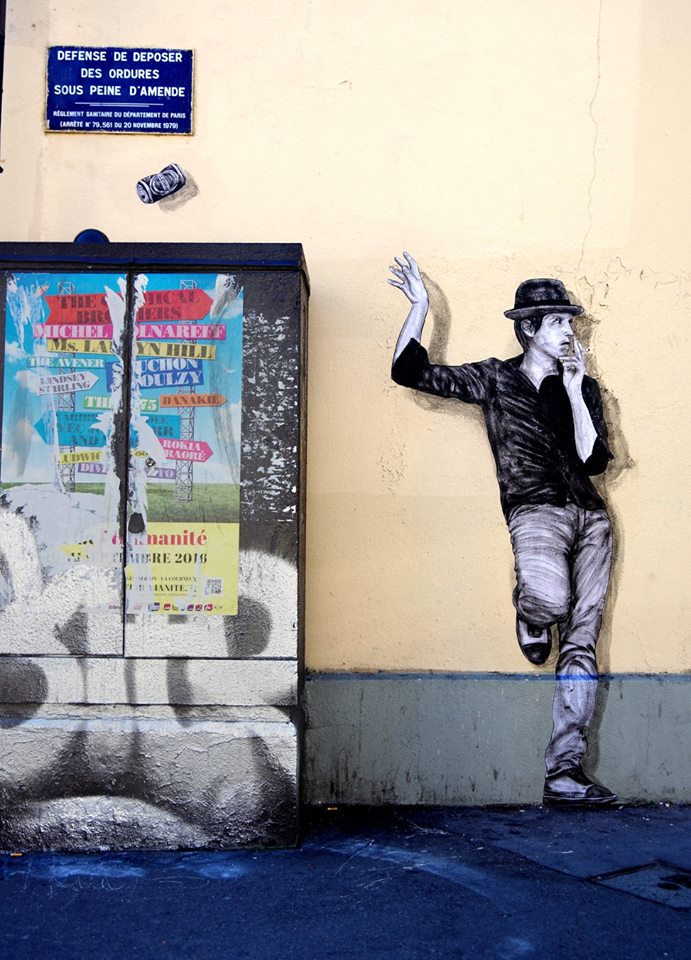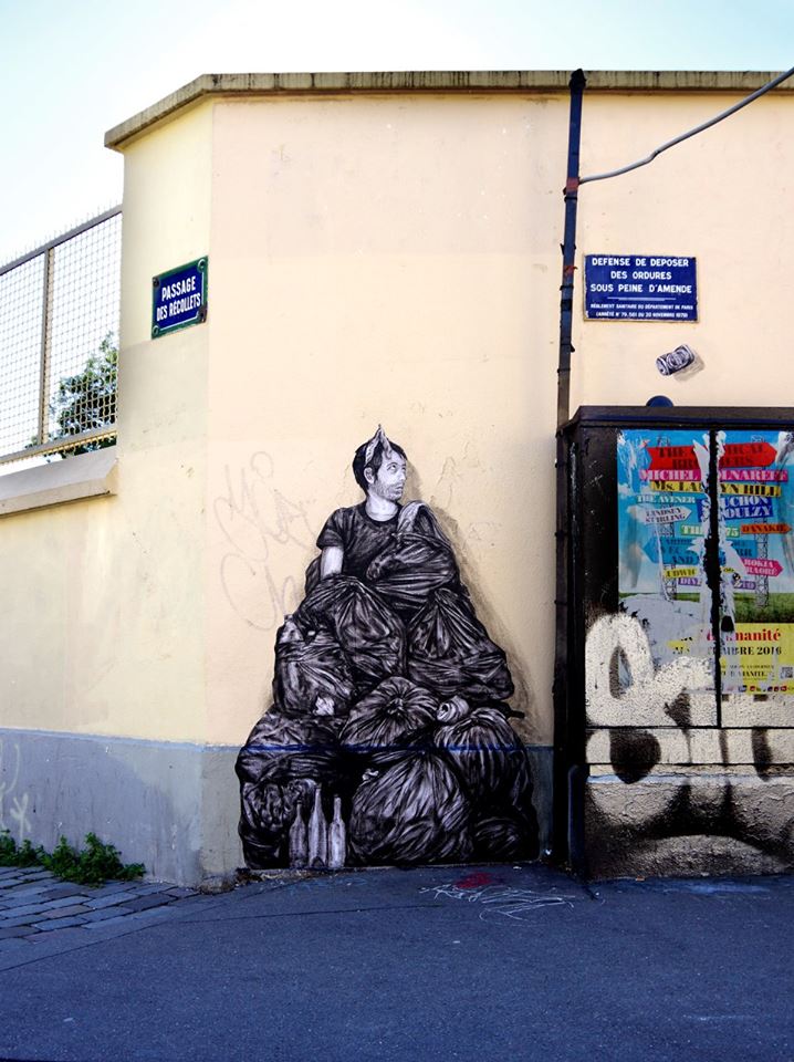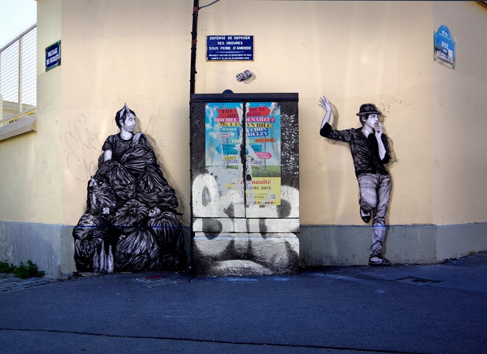 « Vases communicants » est le nouveau collage de Levalet, face au Jardin Villemin dans le 10ème arrondissement parisien.