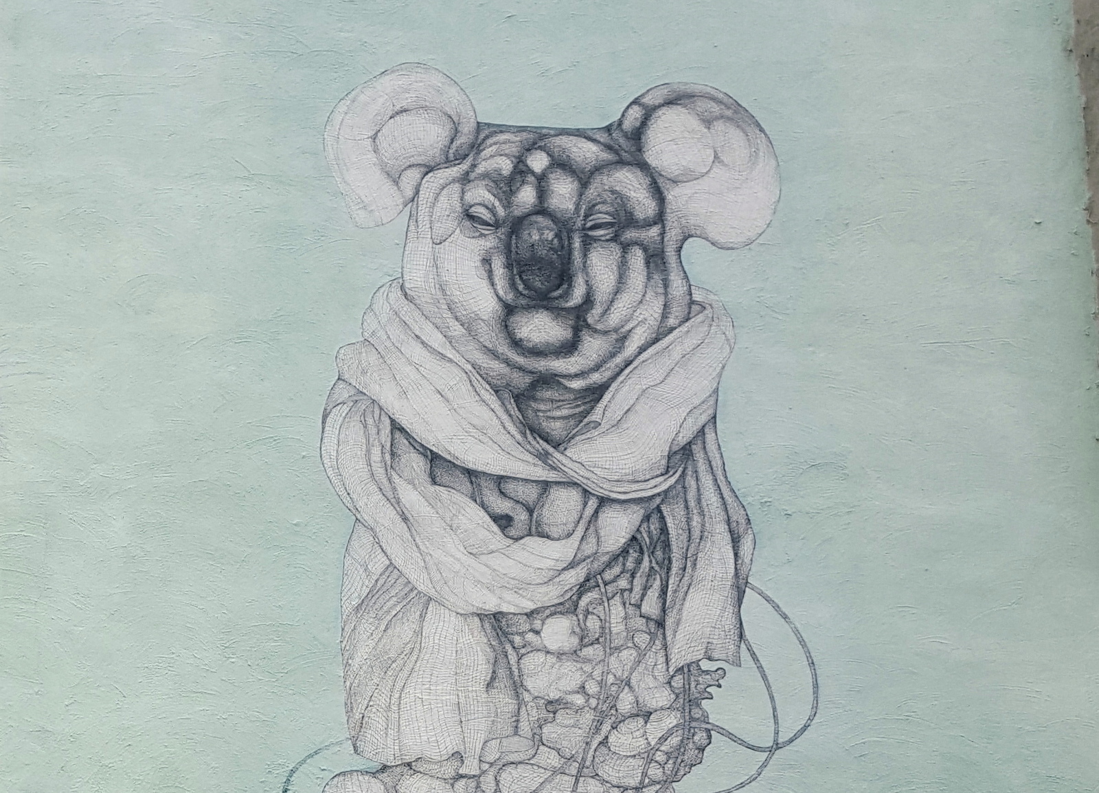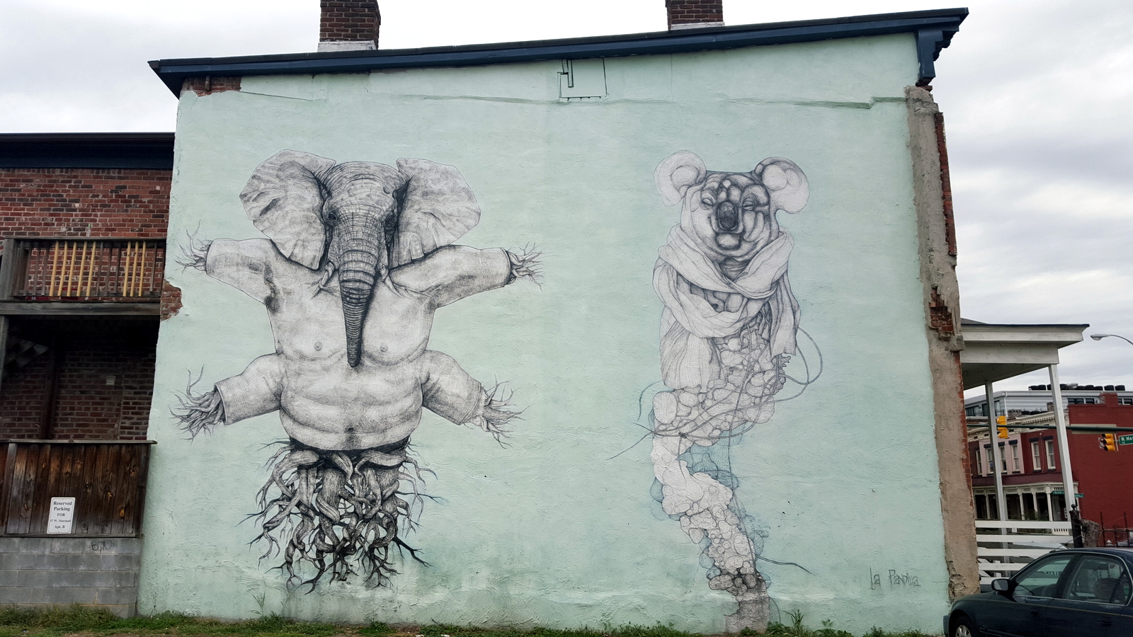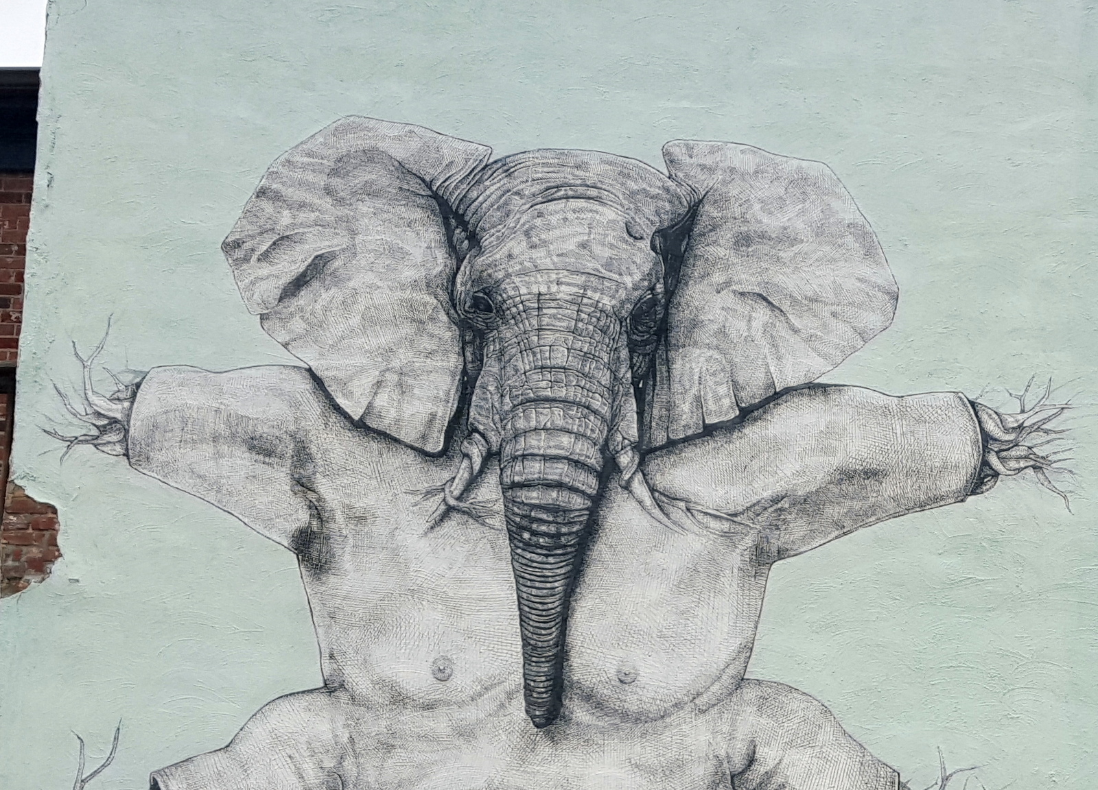 Reprenant leurs codes habituels, fond coloré pastel, dessin précis au trait fin, le tout représentant un bestiaire « hyperréaliste imaginaire ». Ici, lors du G40 Art Summit 2012 (Richmond Mural Festival), les deux amis du gang artistique ont représenté deux de leurs animaux fétiches, un éléphant tentaculaire à quatre bras musclés et le panda.
