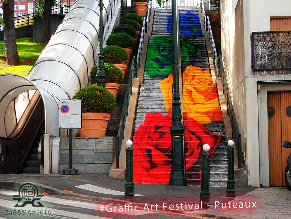 Pour sa 6ème édition, le festival Rue-Stick a été rebaptisé Graffic Art Festival. Une vingtaine d’artistes, dont le célèbre duo Zag & Sìa, ont investi les 10 et 11 septembre derniers les rue de Puteaux. Le duo passé maître dans l’art de l’anamorphose a posé sur les escaliers de la rue Monge (au niveau du N°7) cette piquante et colorée nature morte. Un beau cadeau de Zag & Sìa à la ville de Puteaux dont la culture de la rose a été l’une des principales sources de richesse les siècles passés. La « rosa bifera officinalis » ou « rose de Puteaux » était cultivée ici pour ses vertus curatives et son parfum. Elles sont toujours vendues aux pharmaciens pour la composition d’onguents et aux parfumeurs pour leur singulière odeur.