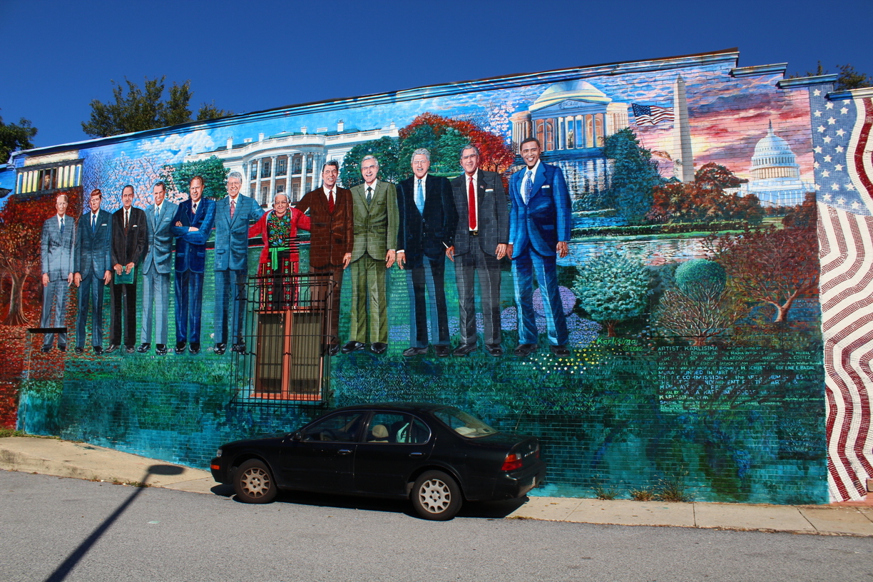 Cette fresque bien connue des habitants du quartier d’Adams Morgan à Washington DC est une représentation des douze derniers présidents américains. De la place est libre à la droite de Barack Obama -le dernier président élu en 2008 puis reconduit en 2012- pour accueillir le prochain président.