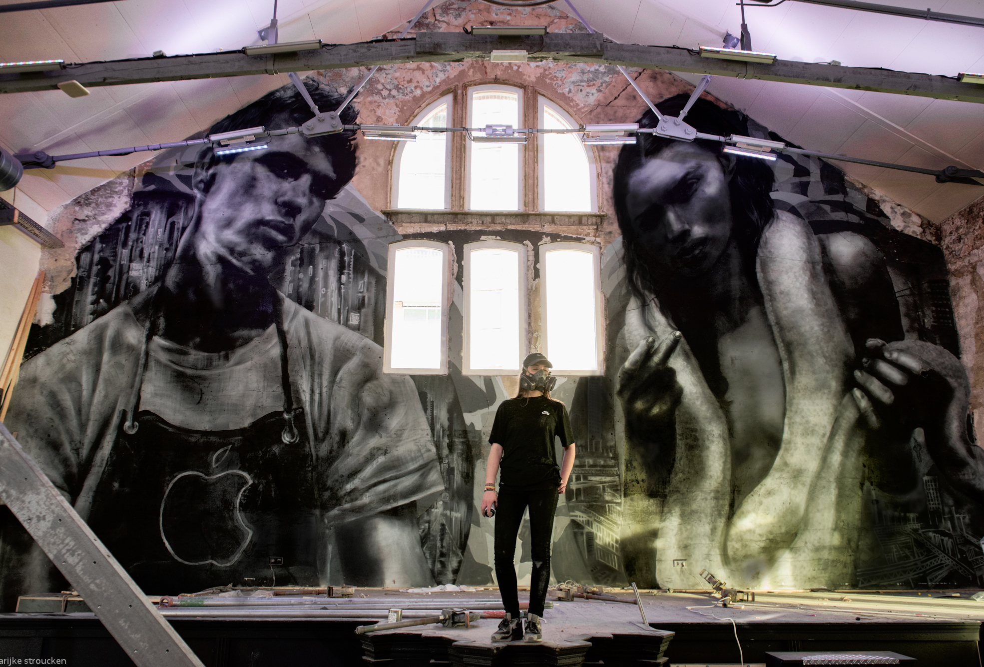 JDL vient tout juste de terminer cette peinture murale représentant l’exclusion du Paradis. Adam et Ève en mode urbex, peints sur fond de paysages industriels. Le bâtiment a été choisi pour sa ressemble avec une église, il est situé sur « paradijsplein » dans la capitale des Pays-Bas (paradijs signifie «paradis» en néerlandais).