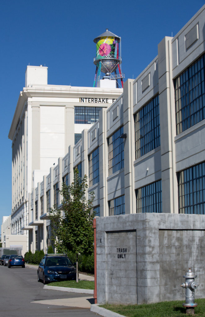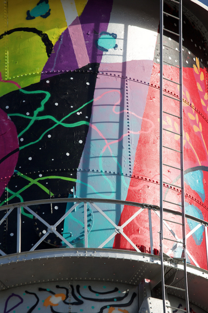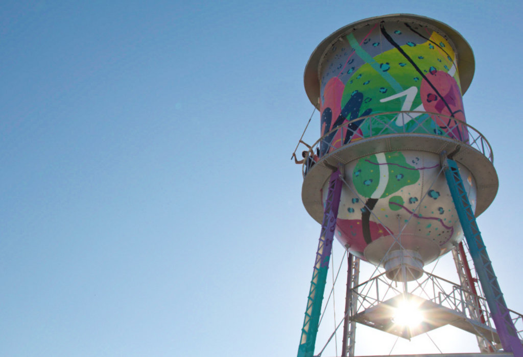 MIckaël Broth a réalisé cette oeuvre en 2016 sur une construction très emblématique des Etats-Unis, une citerne en acier construite dans les années 1920 et juchée au somment d’une ancienne usine de biscuits maintenant reconvertie en luxueuse résidence.